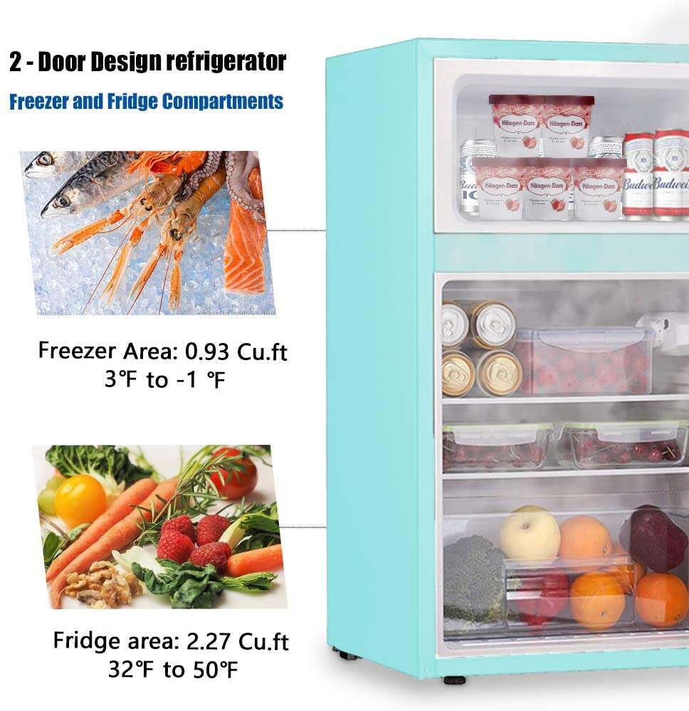 - 【Compact Size & Large Capacity】- The double door electric fridge with 19″(W)x 33.5″ (H)x 20″(D). 0.93 Cu.ft freezer features ample storage space can be used storage your ice cream,meat. And 2.27 Cu.ft fridge area with fruit and vegetable drawer Separately,can keep fruits and vegetables fresh longer. The inside of the door with racks (which prevent from falling)also can store food,you can place bottles and cans.More spacious than usual mini-fridge.