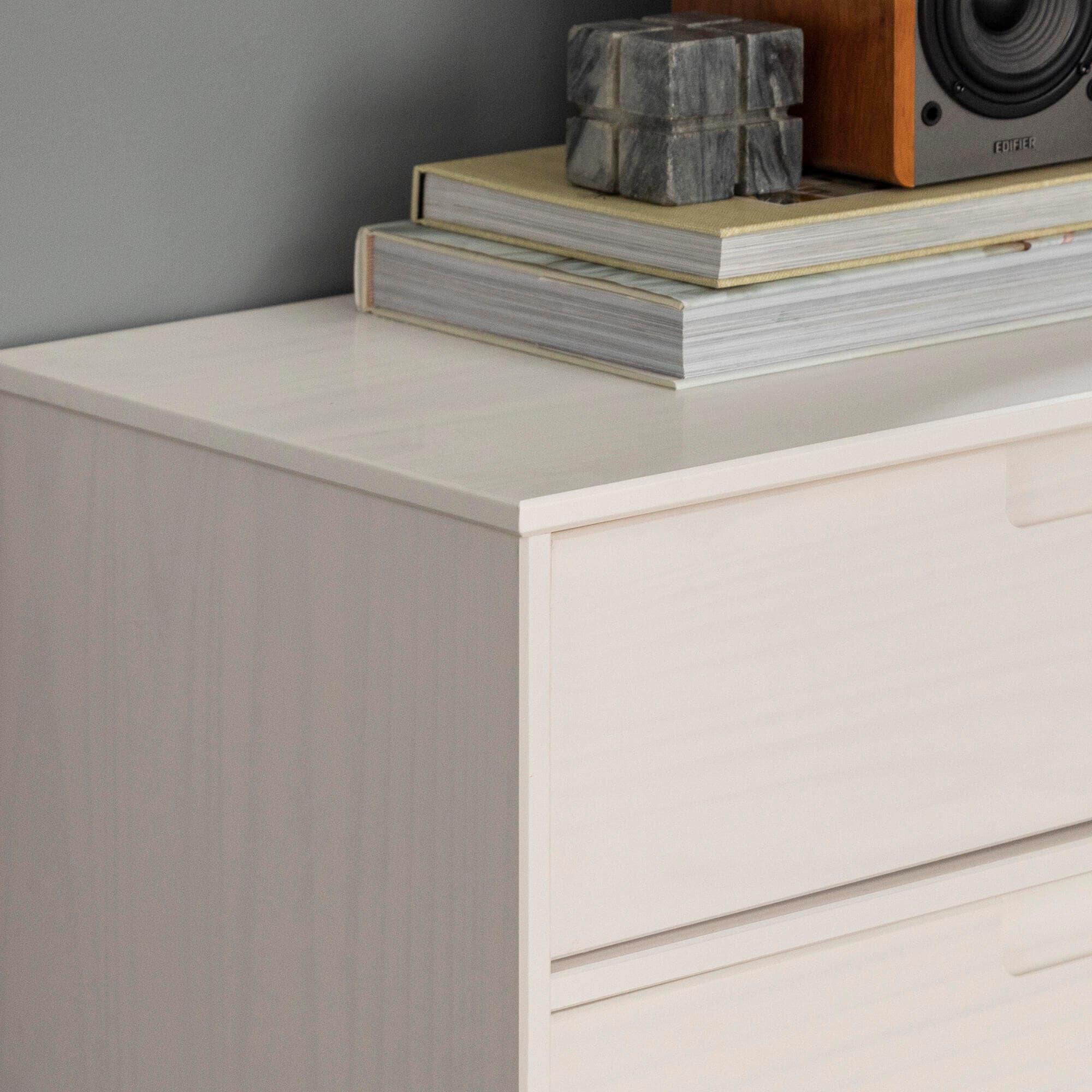 Add storage space into your home for your clothing and extra throws or pillows with this 6 drawer dresser. In a stylish, mid century modern design featuring angled legs and cutout handles of solid pine wood in a stained finish. The intriguing design integrates a transitional aesthetic to complement your home dcor. With six storage deep drawers to keep your clothing organized in your bedroom or for blankets and extra bedding in your guest room.