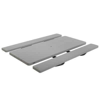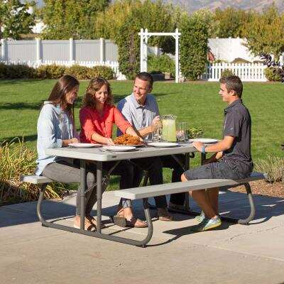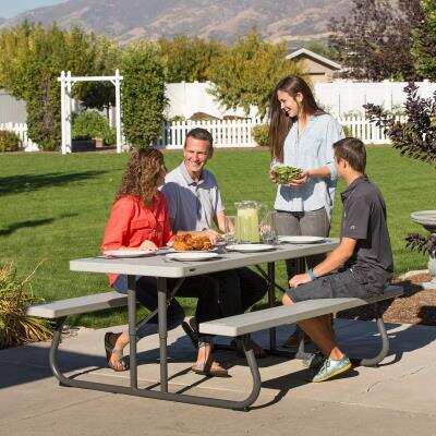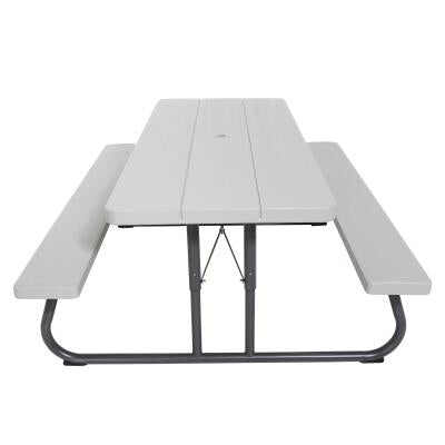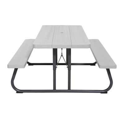 6-Foot Picnic Table – The 72 in. x 30 in. high-density polyethylene tabletop is stain resistant, easy to clean, and folds flat for storage. This model comes in gray matters with a wood grain texture and a gray sand 1-5/8 in. round folding frame that includes an umbrella hole and cap. Single box packaging. 2-year limited warranty.