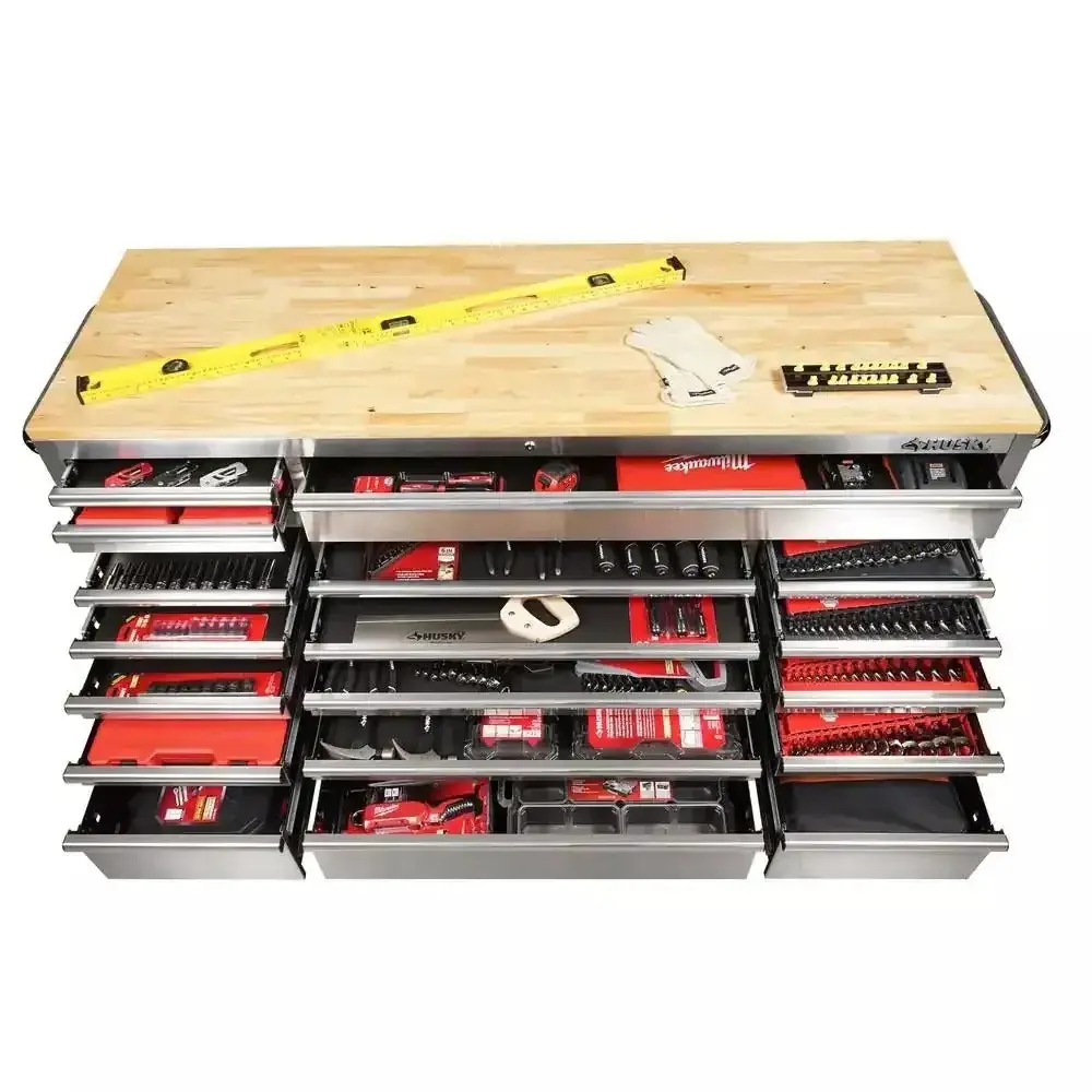 72 in 18-Drawer 24 in. D Mobile Workbench with Solid Wood Top Stainless Steel