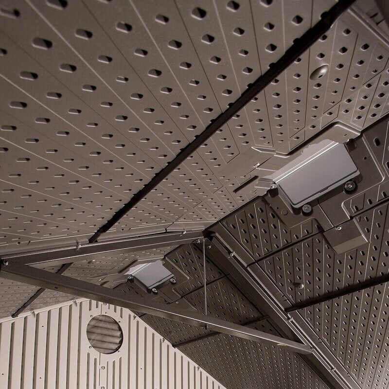 - Includes 3 small skylights, 5 shelves, corner shelves comes with 2 Peg strips