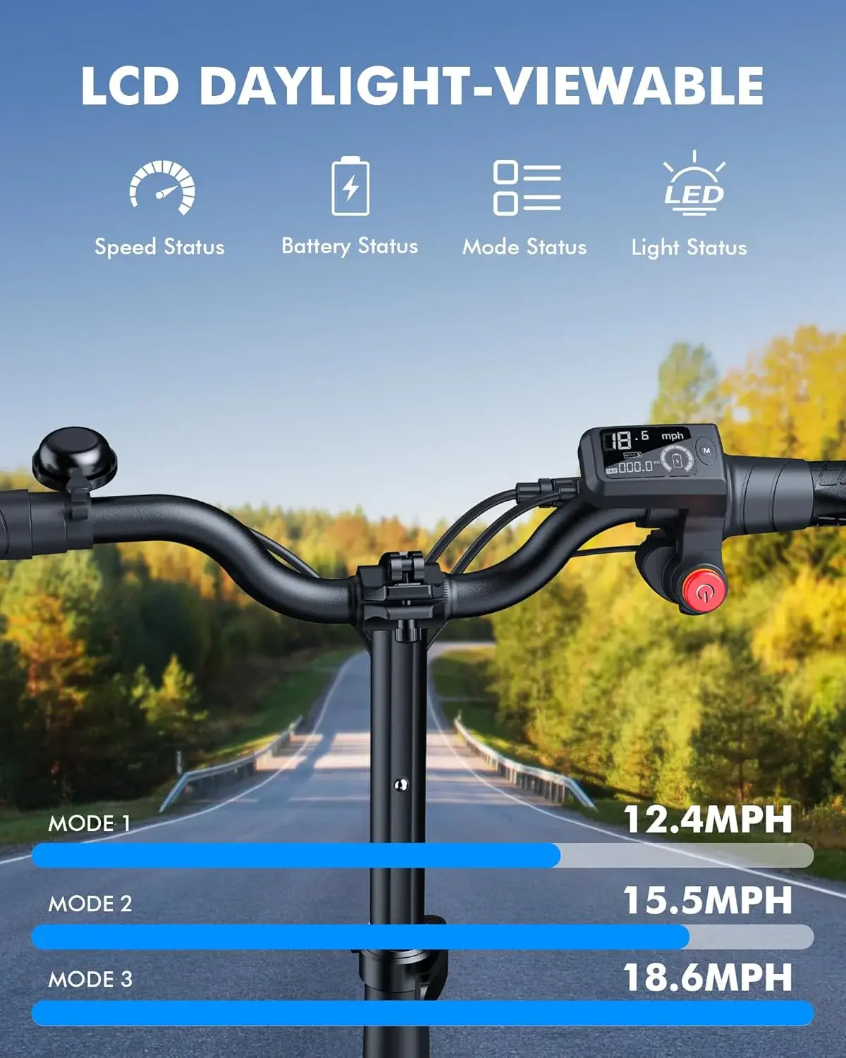 • Digital display showing speed, battery level, and riding modes