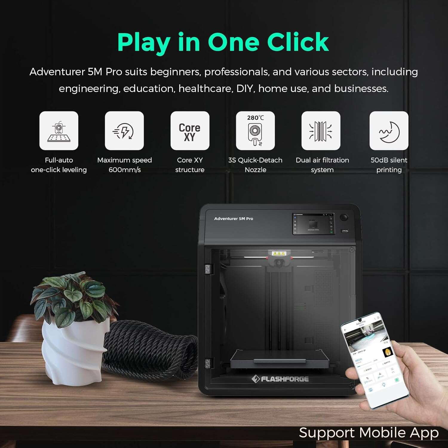 With impressive print speeds of up to 600 mm/s and high acceleration, the Adventurer 5M dramatically reduces printing time without compromising quality. The 220 × 220 × 220 mm build volume provides enough space for a wide range of projects, from functional parts and prototypes to detailed models and miniatures.
