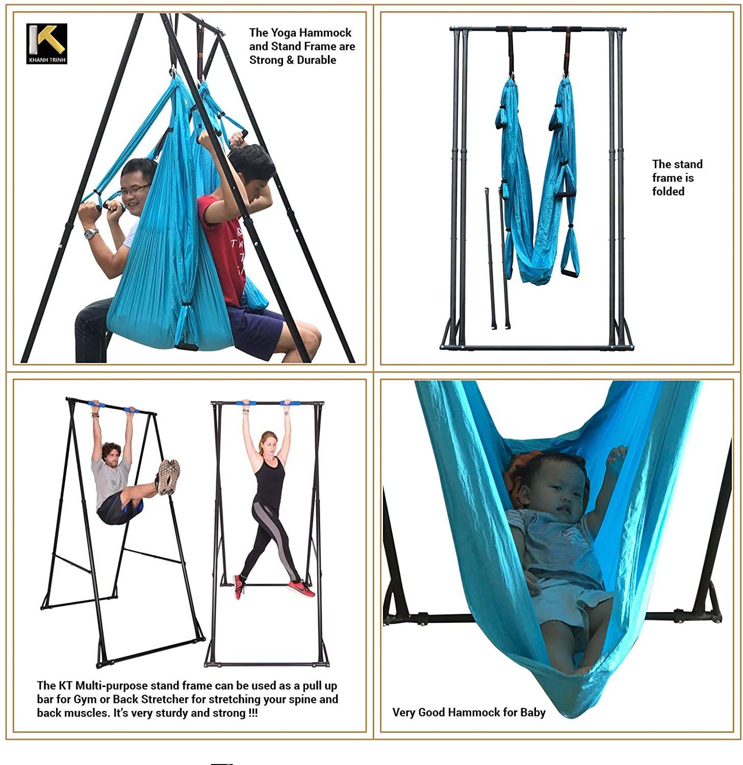 - The KT aerial yoga stand frame has other good features that i think you will like them: 1. STURDY, LOW VIBRATION and high FORCE-BEARING CAPACITY during exercise. 2. DURABLE, comes with an astonishing 05 years warranty. 3 FOLDABLE: It takes LESS THAN 10 SECONDS TO FOLD UP this stand frame after use, so it��s convenient and easy to move this portable aerial yoga stand frame anywhere in your home/office