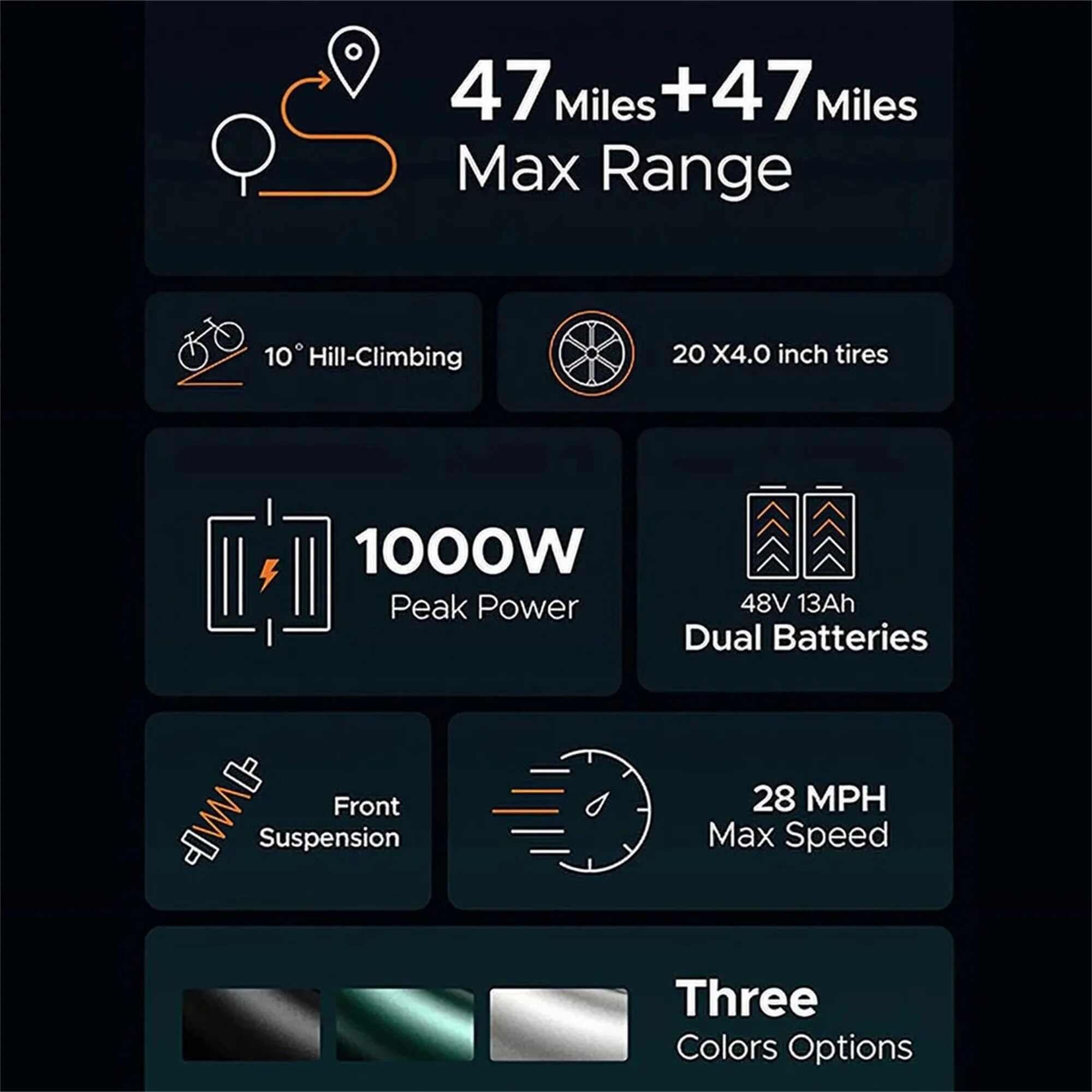 【Best Retro Motorcycle-Style Ebike Under $3000】The Ebike is a retro light-duty electric off-road bike,based on the appearance and function of traditional off-road motorcycle redesigned, it has different highlights from other electric bikes. Smooth body lines de 【Upgraded 1000W Brushless Hub Motor and 7-Speed Gear System】 The 1000W peak brushless hub motor offers enhanced climbing ability, reaching speeds of up to 28 mph and 55N.m torque in pure electric mode, effortlessly conquering gradients of up to 35 degrees. The 7-speed gear system caters to all your riding and training needs. Additionally, it features brighter LED headlights and taillights to keep you visible and safe during nighttime rides. 【Extended Range up to 94 Miles with 48V 26A Dual Battery】 The dual-battery version offers a maximum range of up to 94 miles. In pure electric mode, travel up to 34.17 miles, or switch to assist mode for up to 47 miles. For the ultimate long-range experience, achieve up to 68 miles on a single charge, perfect for long rides on your cruiser or mountain ebike. 【All-Terrain Capability with 4.0*20 Inch Fat Tires & Full Suspension】 Equipped with 2 front fork spring shock absorbers, 2 seat shock absorber springs, and 2 puncture-resistant 20"X4" fat tires, providing outstanding shock absorption performance. Combined with front and rear mechanical disc brakes and the EABS system, you can enjoy a comfortable riding experience and powerful braking even on steep slopes, rugged terrain, or other extreme terrains. 【Safe and Quiet Ride with Dual LED Headlights & 30db Low Noise Level】 Ride confidently with dual headlights and taillights for enhanced visibility. Front and rear disc mechanical brakes offer smooth stopping power. The low noise level of just 30db ensures a quiet and peaceful journey. 【Certified and Reliable with UL Certification & Comprehensive After-Sale Service】 The UL certified ENGWE M20 comes 90% pre-assembled and includes a one-year warranty on motors, batteries, and controllers.