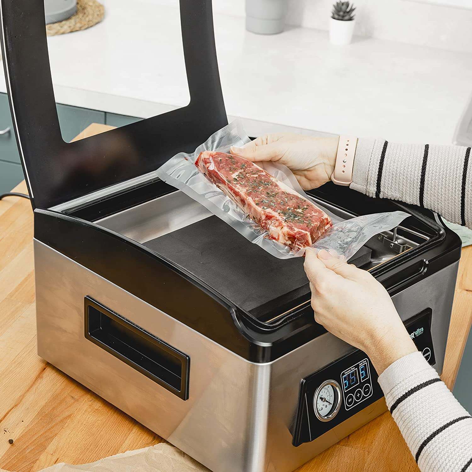 - COMPACT SIZE WITH ONE TOUCH EASY TO USE CONTROLS �� Set the program and forget it! Perfect packs each time, automatically, ensuring a perfect positive seal each time! Locks In freshness, nutrients, odors and prevents freezer burn. The USV32 vacuum chamber sealer machine is the ultimate tool for sous vide cooking.