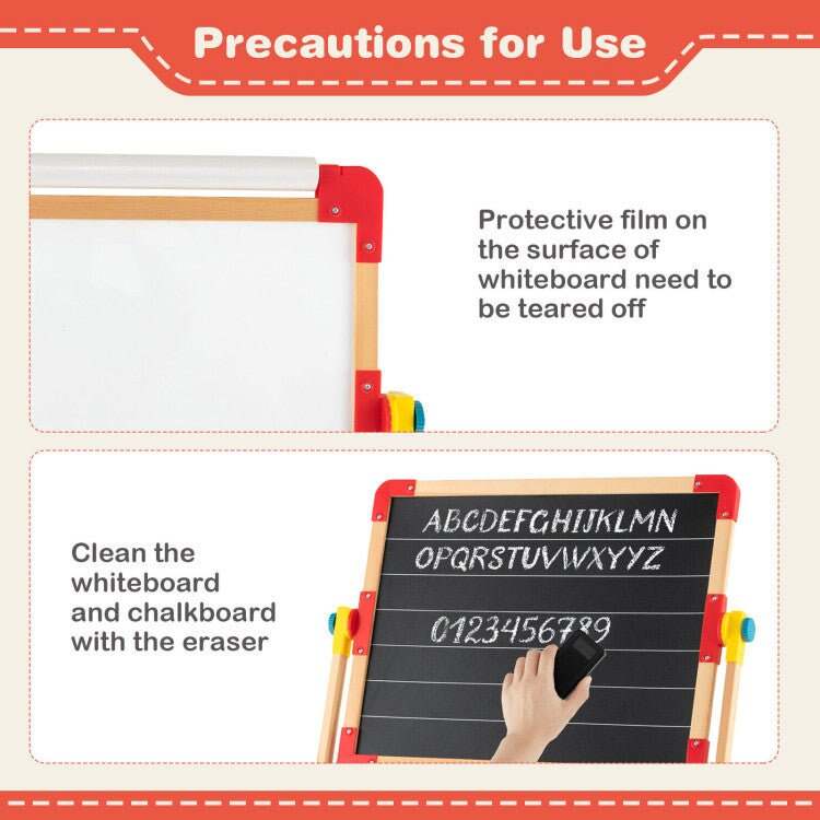 - COMPLETE ACCESSORIES - In order to improve your user experience, complete accessories are included. You may cover the chalk with chalk cases to protect toddlers' delicate skin. Furthermore, the eraser is capable of cleaning both the blackboard and whiteboard, making it highly convenient.