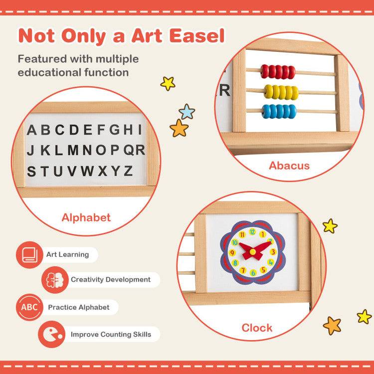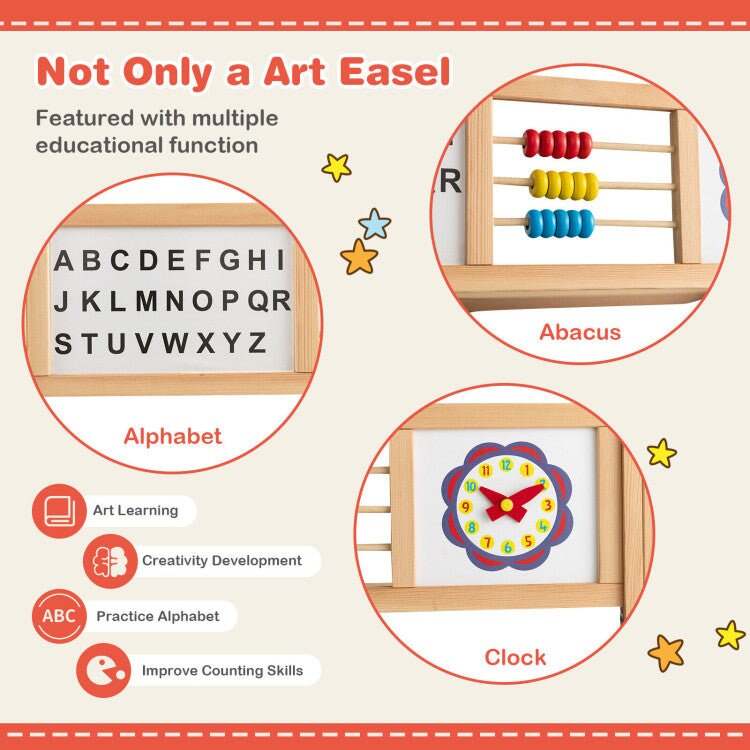 - BEST GIFT FOR EARLY EDUCATION - The toddler wooden easel stand includes multiple educational areas, such as the abacus, clock, and alphabet, which is conducive to early education. These learning areas will cultivate children's cognition of math, English, and art. Likewise, the cute clock helps kids develop the notion of time.