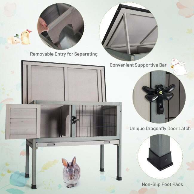 Most importantly, this bunny hutch cage is made of 100% premium fir wood, which has excellent sturdiness and lasting durability. The�solid wood structure can stably accommodate 3 to 4 leverets or 2 to 3 adult rabbits to live together. The elevated design effectively ensures the safety and comfort of the pets' living space.