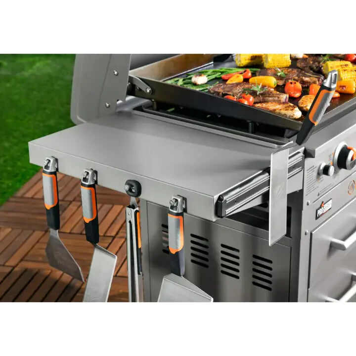 • COMFORT AT YOUR FINGERTIPS – This Griddle comes with a side shelf for placing a cutting board and a garbage bag holder. 1 Lower shelf for easy storage of food and utensils. Easily wheel around your yard or transport from your backyard to the campsite thanks to the removable griddle top, fold up legs and four industrial strength caster wheels. Side handles for easy maneuvering