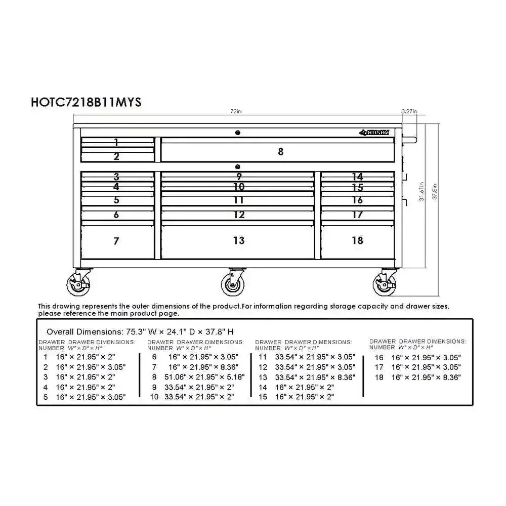 - 72" W × 24" D footprint with 18 drawers in multiple sizes for versatile organization
