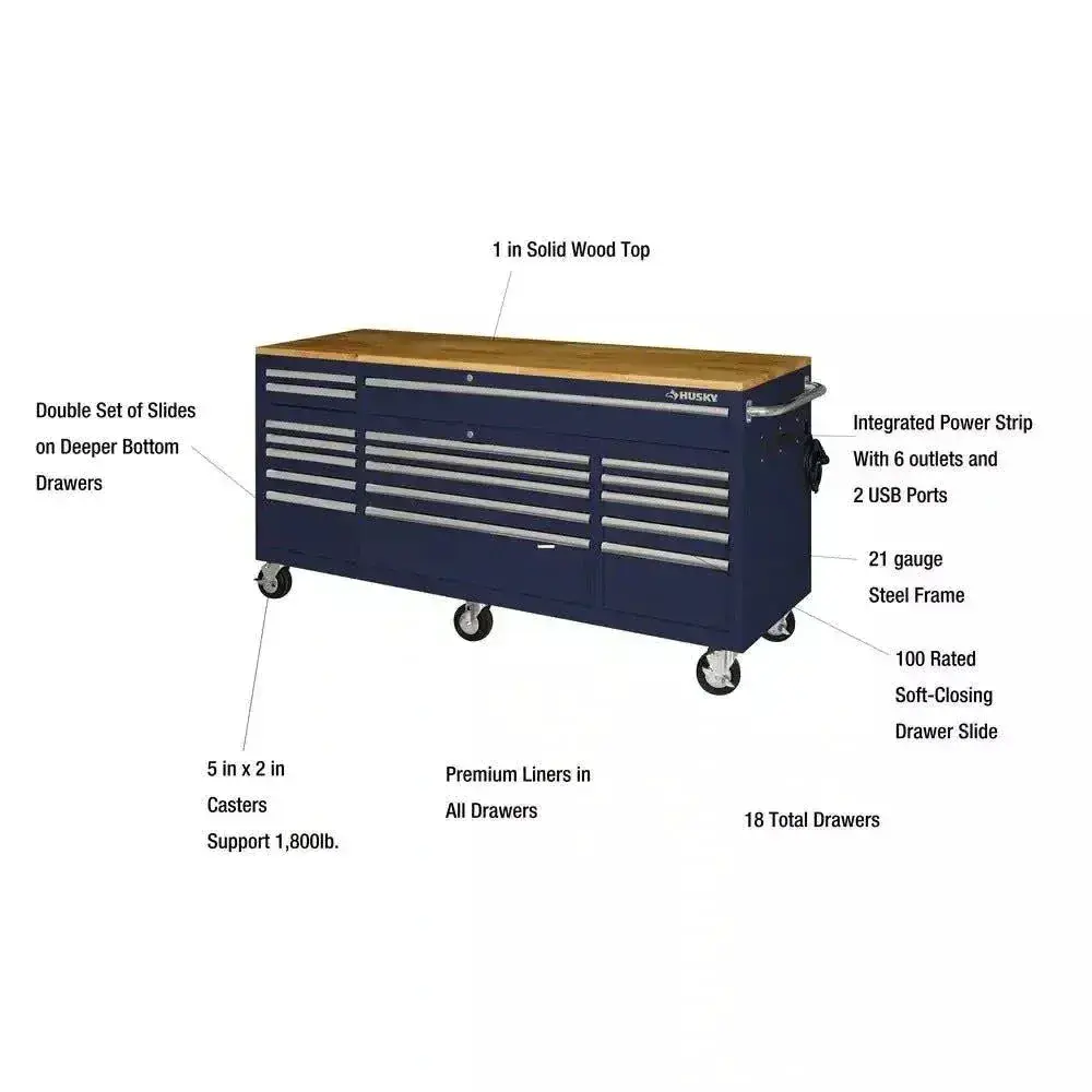 usky 72 in. 18-Drawer Mobile Workbench with Solid Wood Top – Gloss Blue