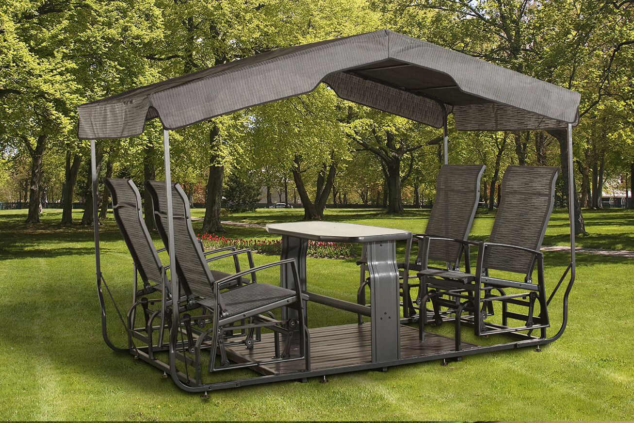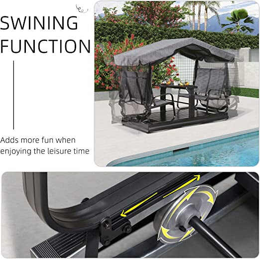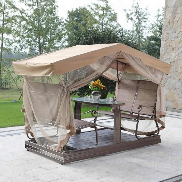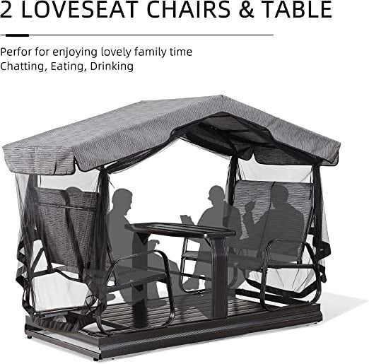 This 4 person porch glider is made of full-cast aluminum frame, Textilene polyester roof , seat and back. Swing benches with glass table is gorgeous in design.