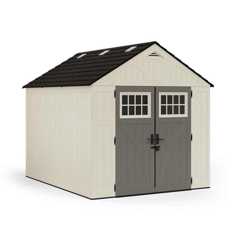 - Classic shed design with architectural details and metal-reinforced shingle-style roof panels