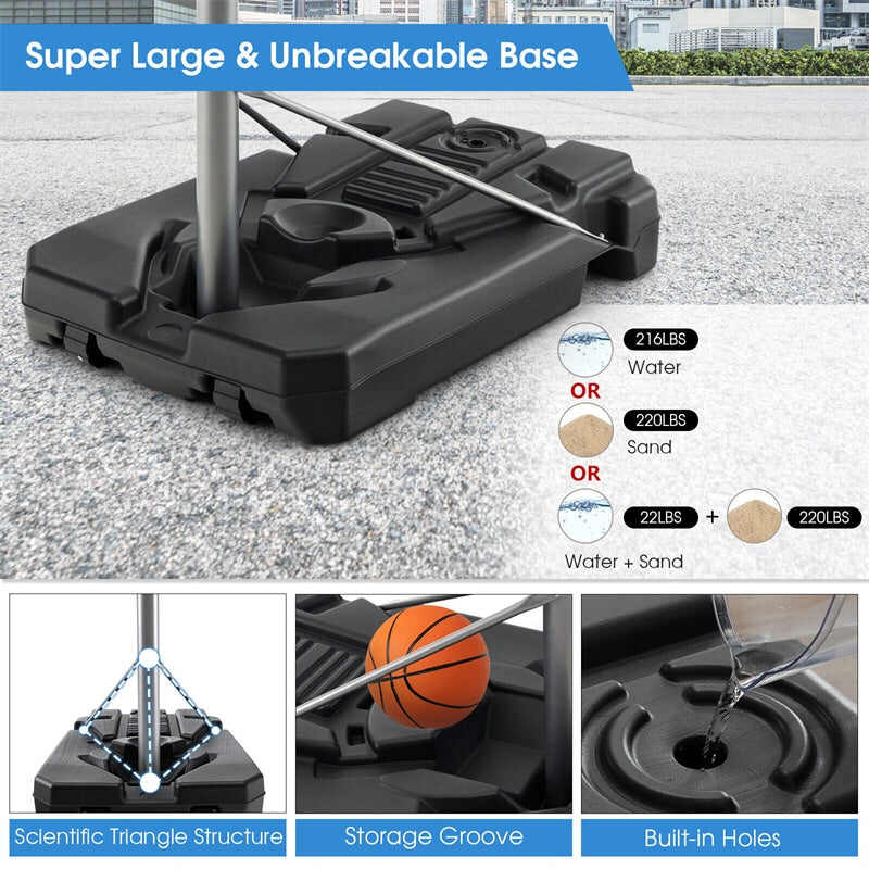 - Fillable Base with Built-in Wheels: The basketball stand base features built-in holes for easy injection of water or sand to lower the center of gravity and improve stability during playing. More than that, designed with 2 built-in wheels, our portable basketball hoop system is perfect for various places with flexible mobility.