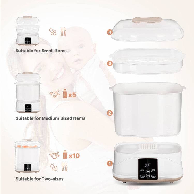 Say goodbye to the hassle of manually sterilizing your baby's bottles, wasting precious time and effort. Our bottle sterilizer and dryer combo does it all for you with just a press of a button. With its large capacity, you can sterilize and dry up to 10 bottles, pacifiers, and other baby essentials all at once, making it perfect for busy parents.