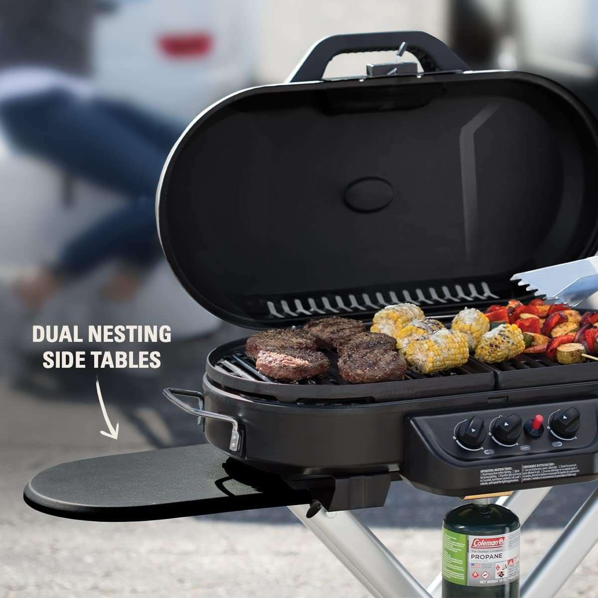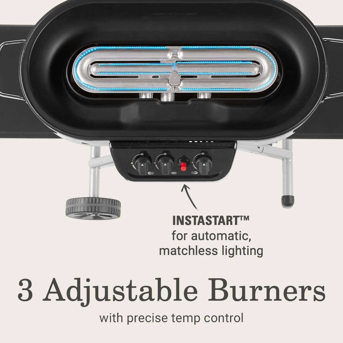 • RoadTrip Portable Stand-Up Propane Grill with 3 Adjustable Burners & Instastart Ignition, 20,000 BTUs of Power for Outdoor Cooking