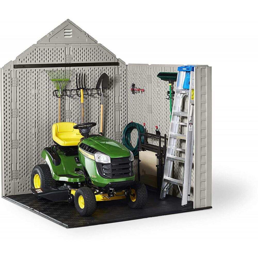 The Rubbermaid 7×7 ft Resin Storage Shed in Sand is a practical and attractive solution for organizing your backyard or garden. With approximately 49 square feet of interior space, it provides ample room for lawn mowers, garden tools, patio furniture, bicycles, sports equipment, and seasonal items while resisting the elements year-round.