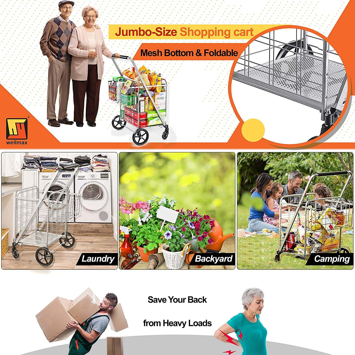 • VERSATILE USES �� The Wellmax shopping cart can carry just about anything. Our customers love using it to transport anything from laundry and groceries, to camping gear and gardening tools! The possibilities are endless. With a large basket volume, this cart can accommodate an assortment of objects in varying shapes and sizes. Other notable uses include storage for sports equipment, beach gear and kitchen supplies.