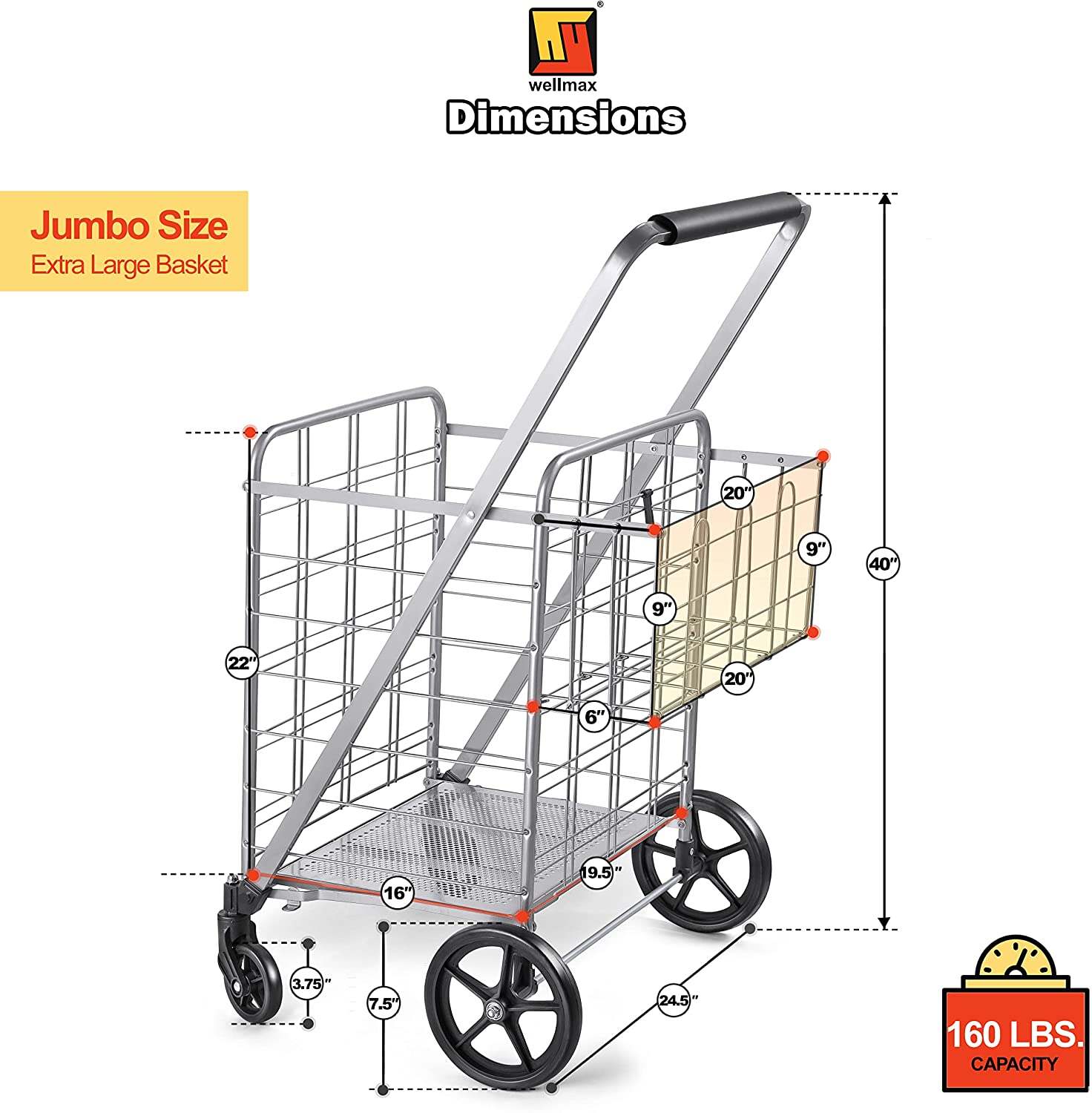 • HEAVY DUTY �� This foldable shopping cart is the perfect size for carrying heavy loads. The Wellmax WM99028S shopping cart can fit oodles of items, up to 150 lbs. Better yet, this cart is engineered to fold flat so it won��t take up valuable room your house or apartment. Functional and efficient design are two of our main priorities at Wellmax!