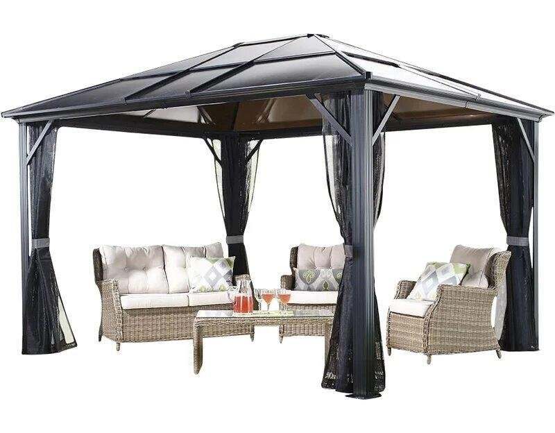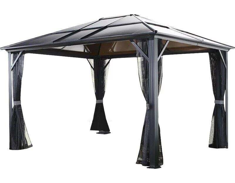 When it comes to keeping a seating arrangement cool or your outdoor table out of the rain, no piece does quiet the same job as a gazebo like this one. Crafted with a powder-coated aluminum frame and capped with a plastic roof, this piece is perfect for standing up to rain, weather, and UV-light. And with the included mesh netting, you can easily keep bugs and pests away while you enjoy the outdoors. This gazebo is designed for year-round use, and must be anchored to a foundation, deck, or patio for use.
