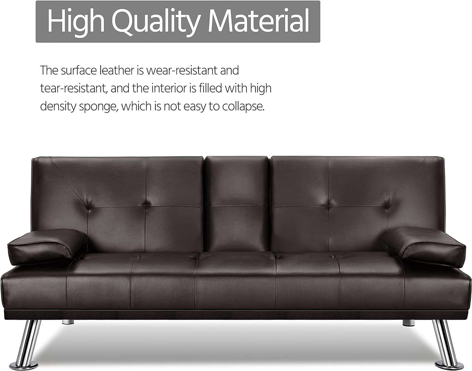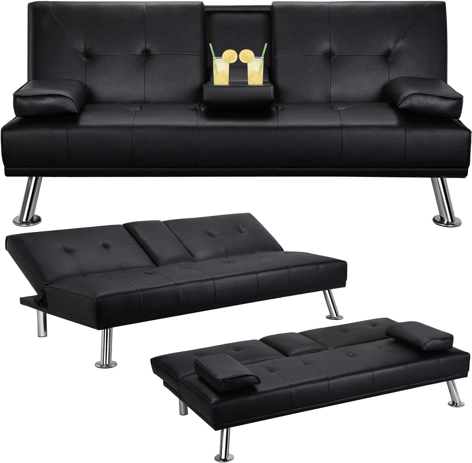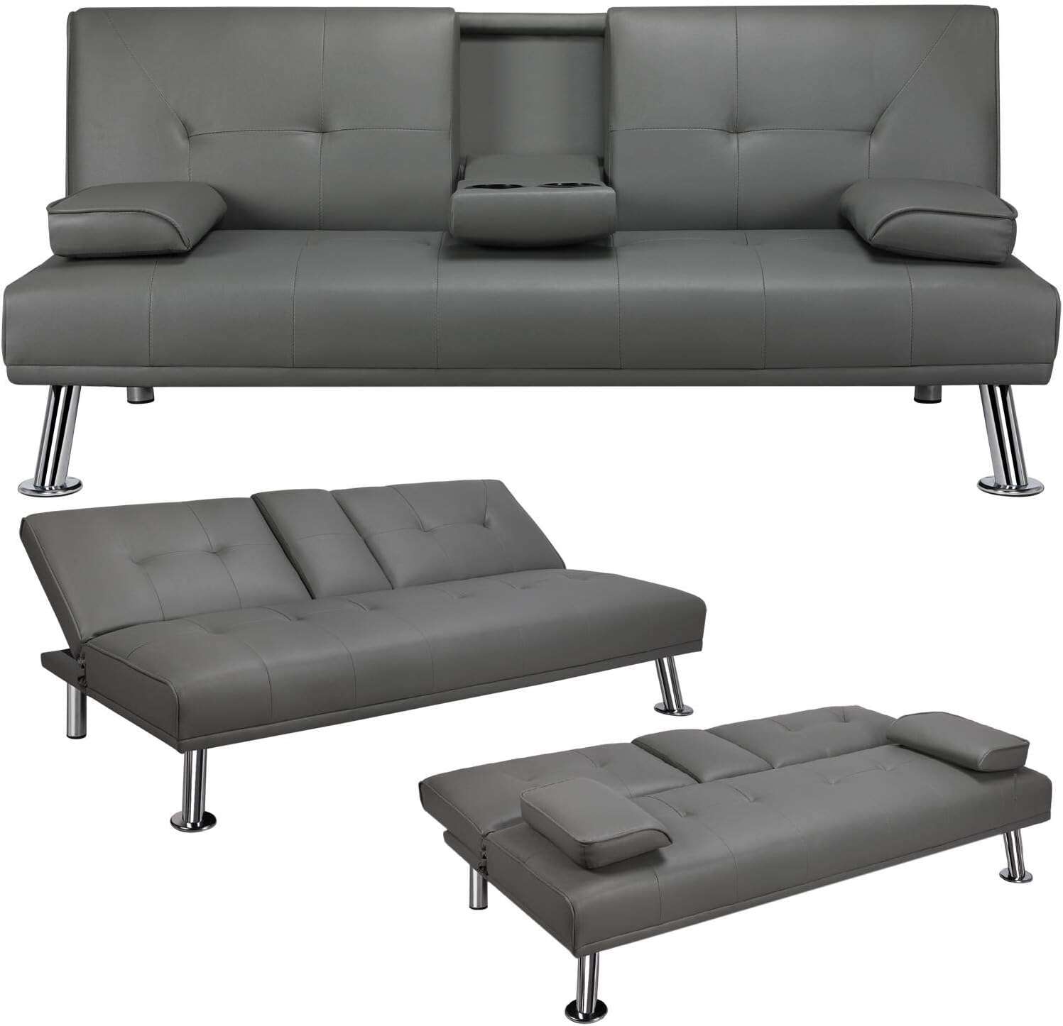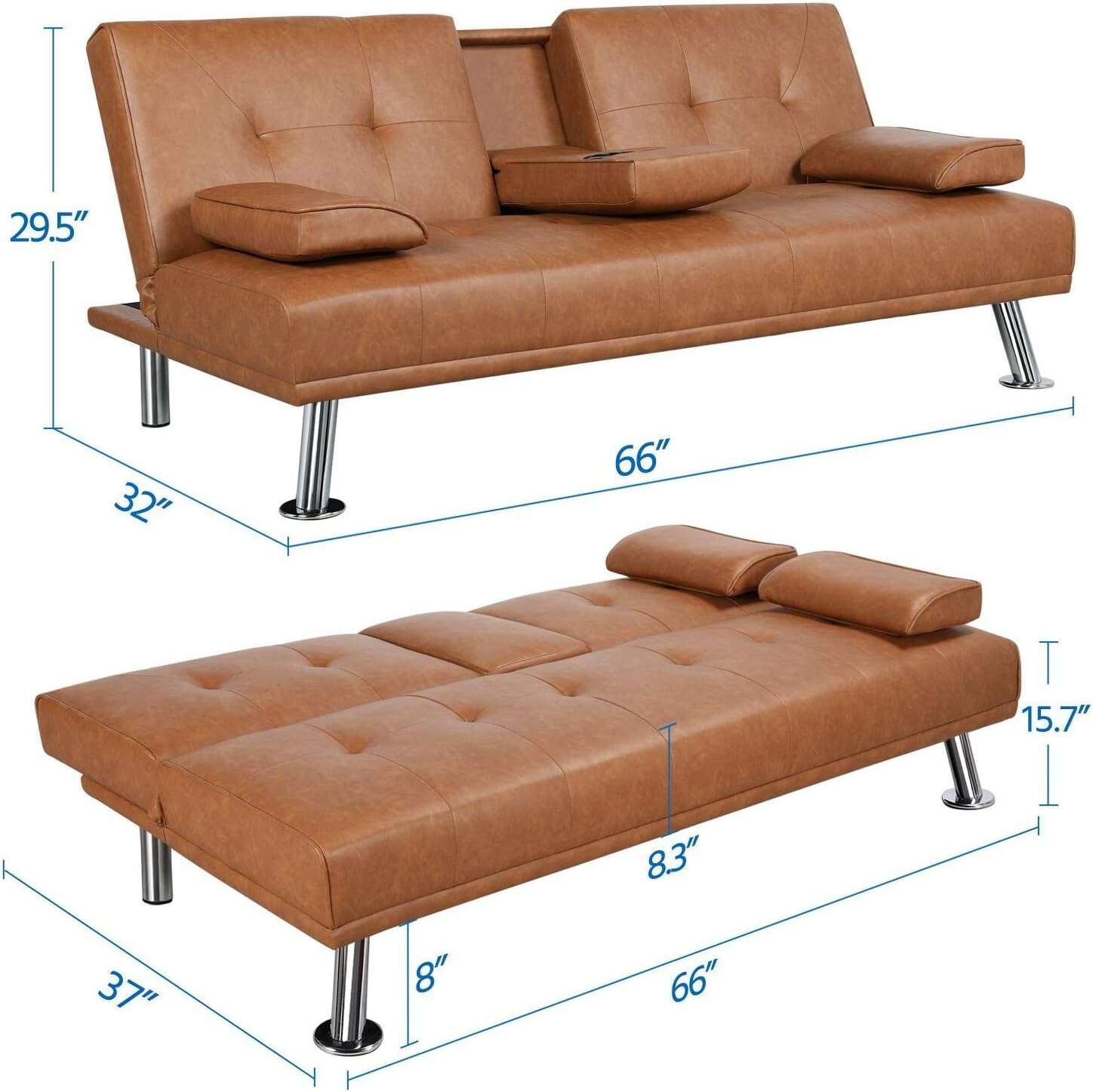 - 【THOUGHTFUL DESIGN】: The leather sofa bed is well designed for entertainment. The middle armrest folds down with 2 cup holders, so you and your friend can relax and enjoy a couple of beverages.