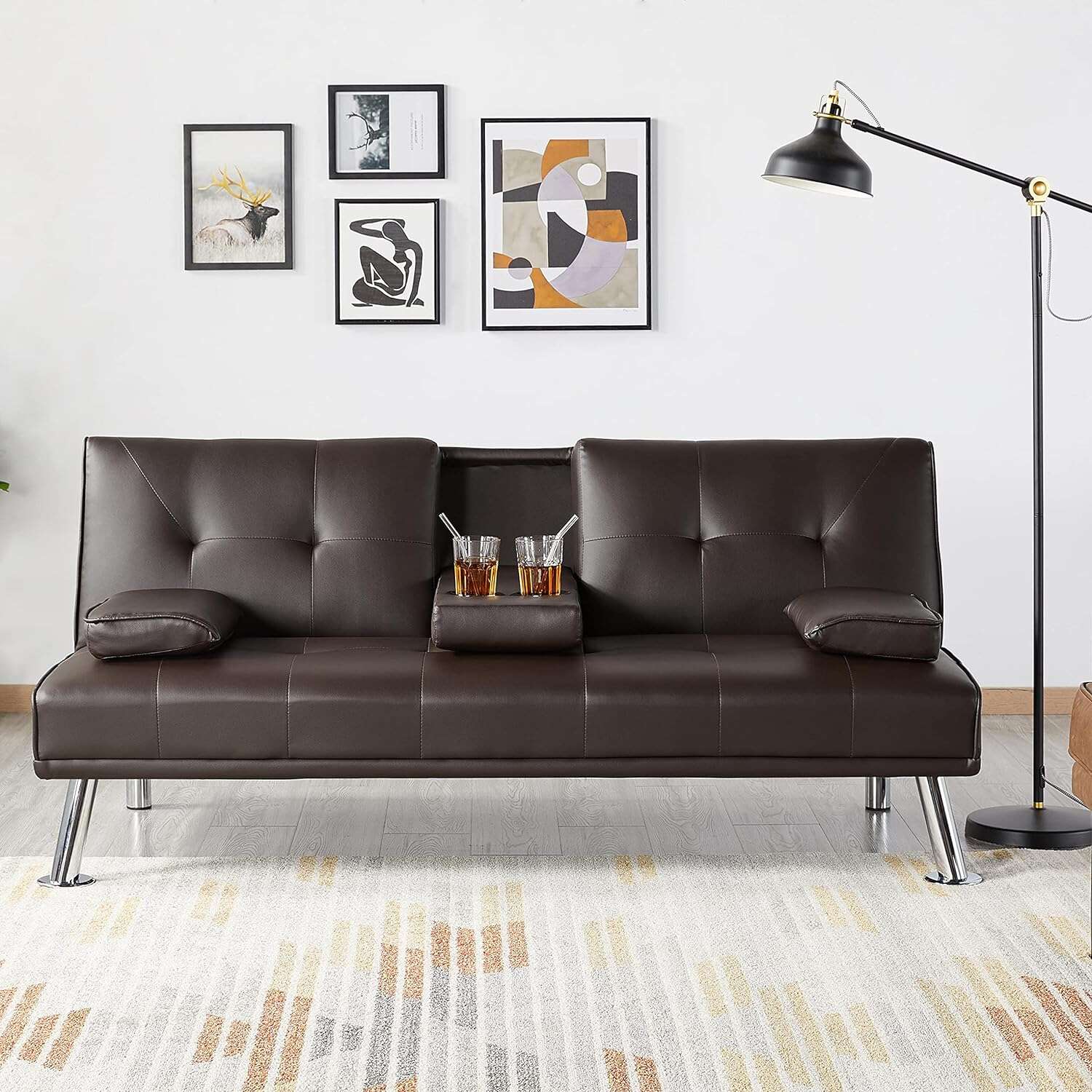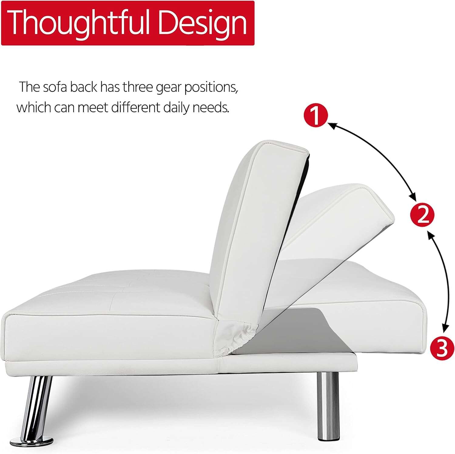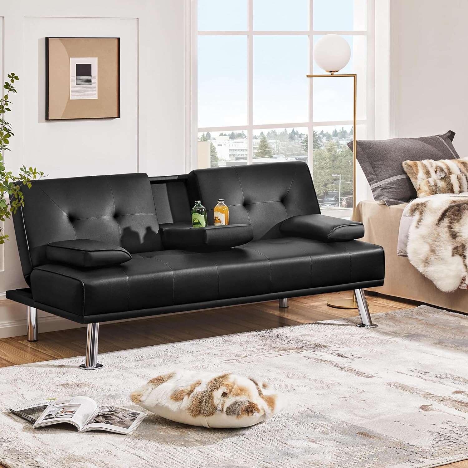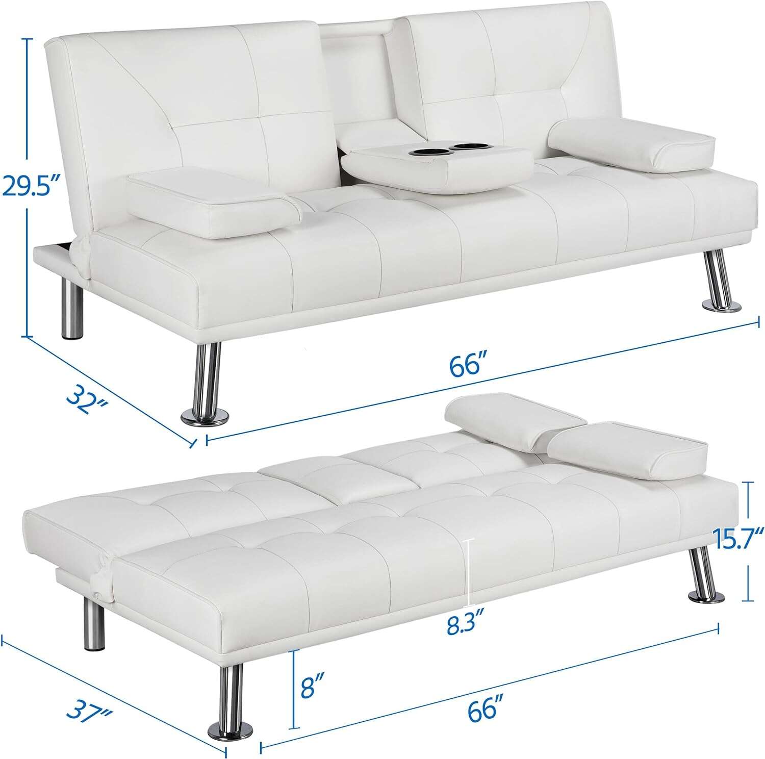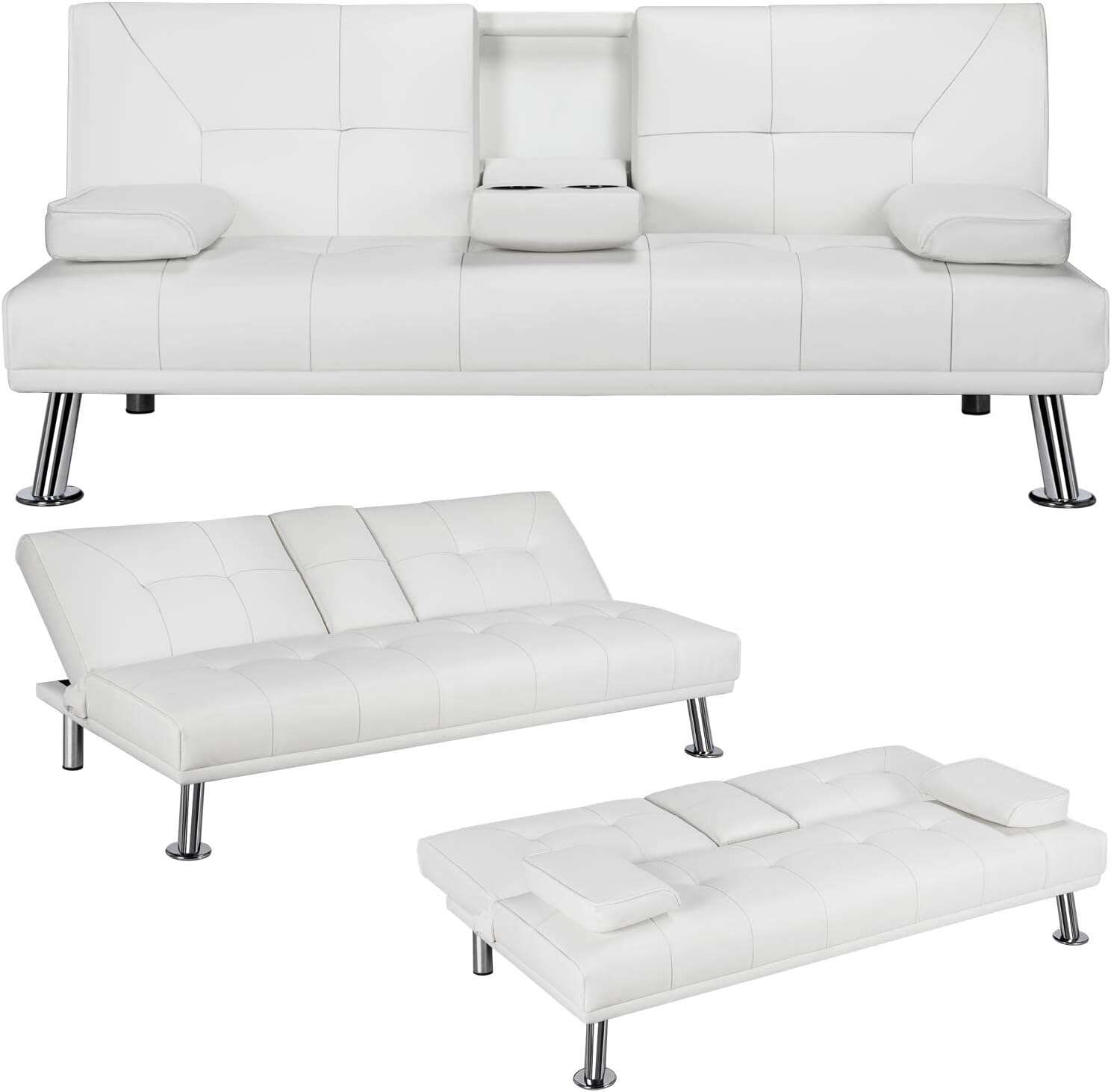 - 【THOUGHTFUL DESIGN】: The leather sofa bed is well designed for entertainment. The middle armrest folds down with 2 cup holders, so you and your friend can relax and enjoy a couple of beverages.