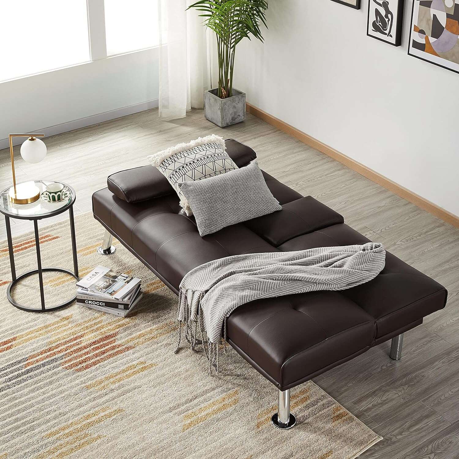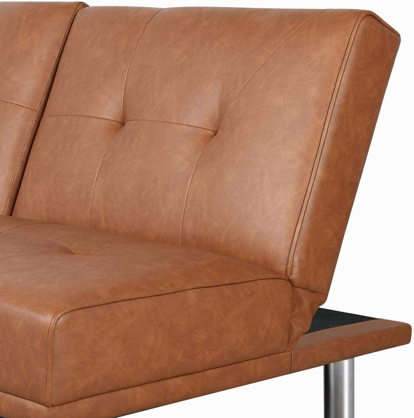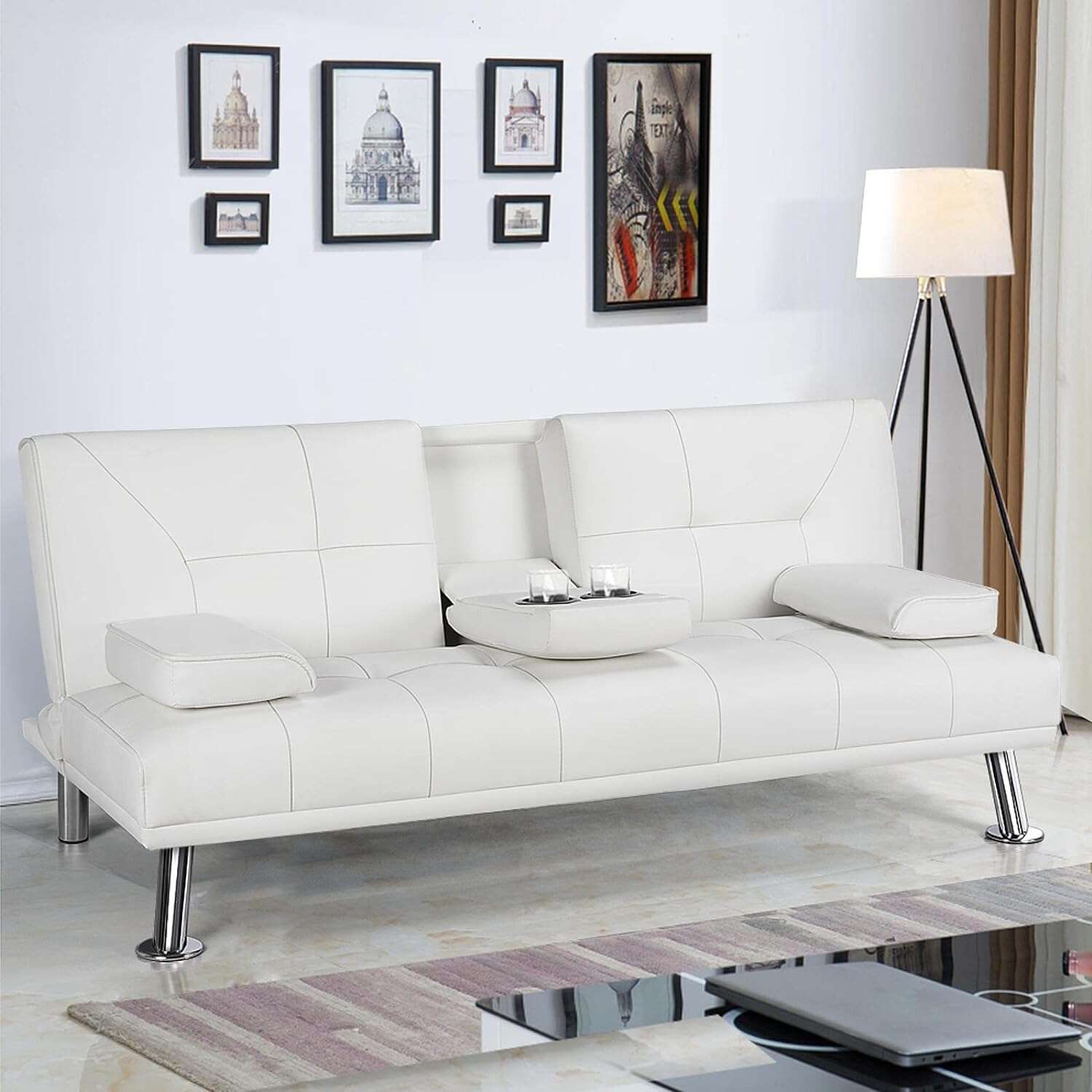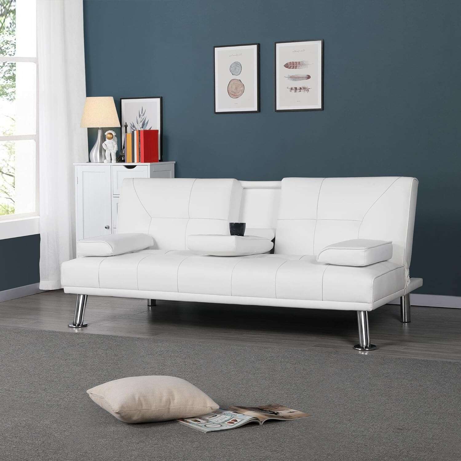 - 【THOUGHTFUL DESIGN】: The leather sofa bed is well designed for entertainment. The middle armrest folds down with 2 cup holders, so you and your friend can relax and enjoy a couple of beverages.