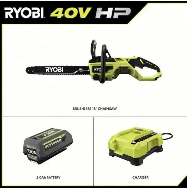 Ryobi 18′′ 40V Cordless Chainsaw Kit with Battery & Charger, Green