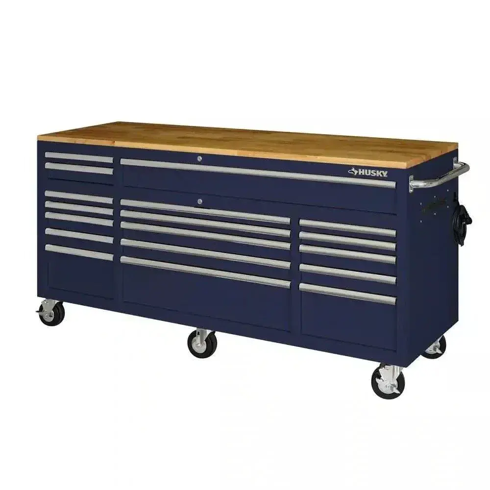 Husky 72 in. 18-Drawer Mobile Workbench with Solid Wood Top in Gloss Blue