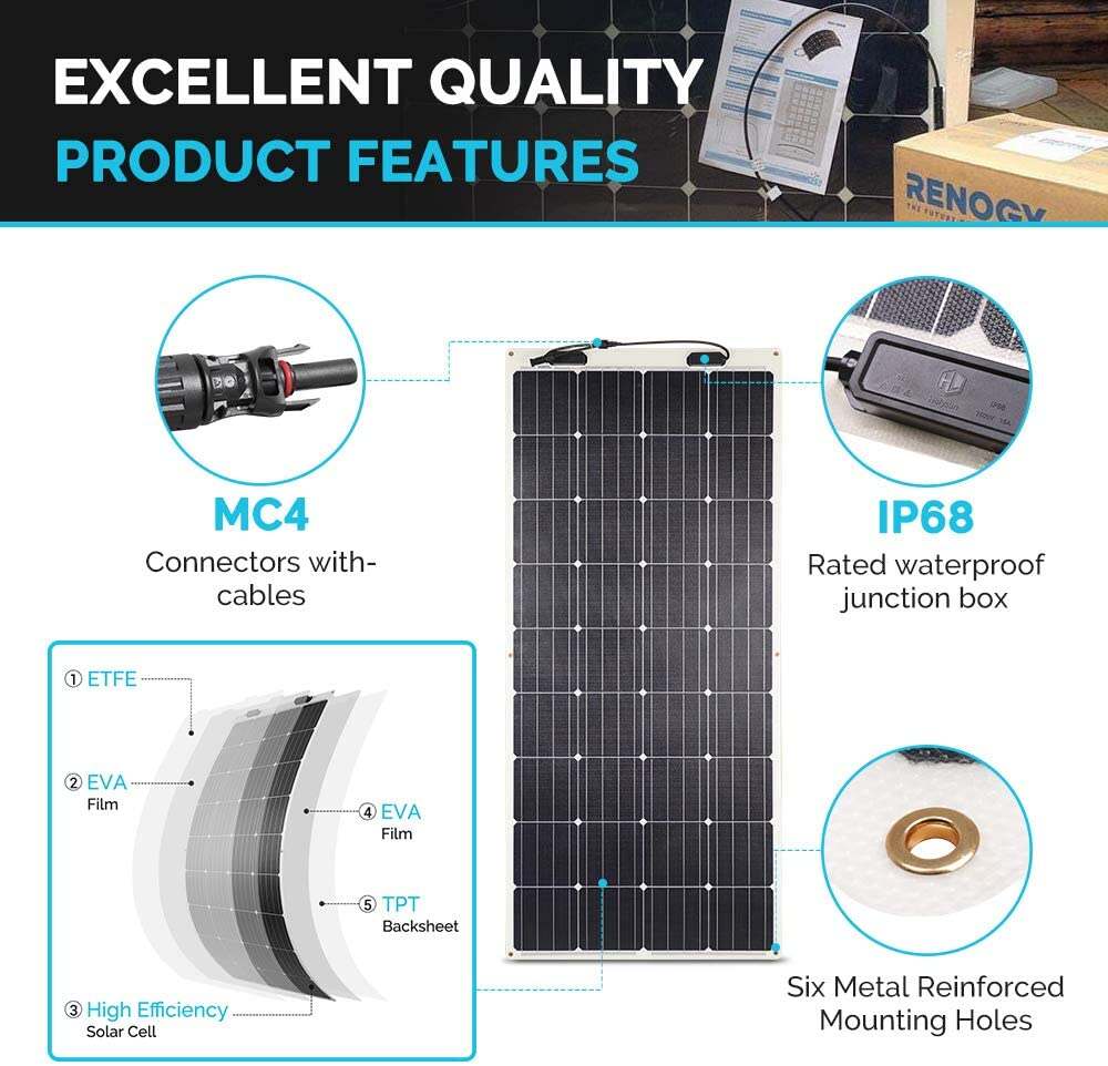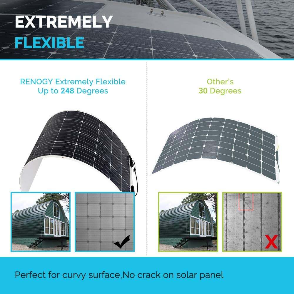 - 【Potential Uses】The Renogy 160 Watt Flexible Monocrystalline Panel can be primarily used on off-grid applications that include rooftop, RV, boats and any curvy surfaces.
