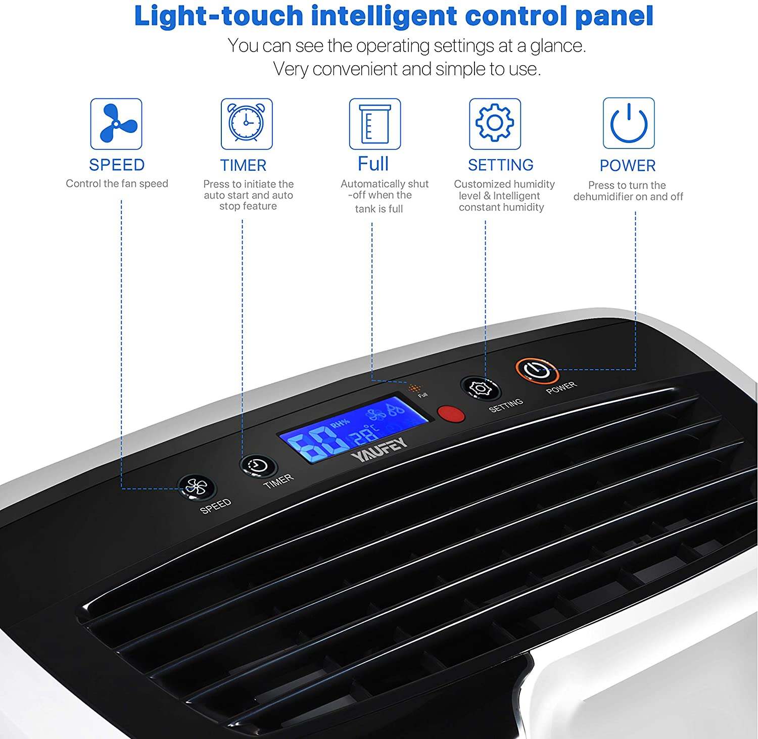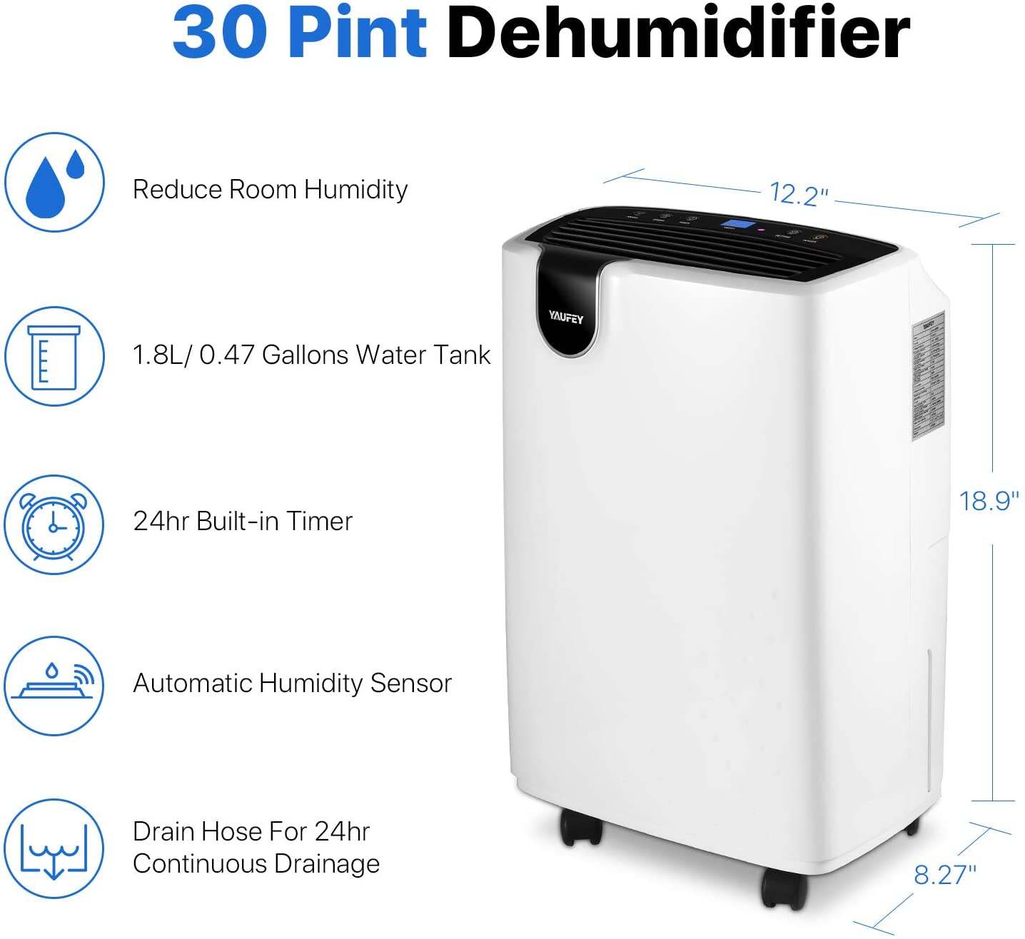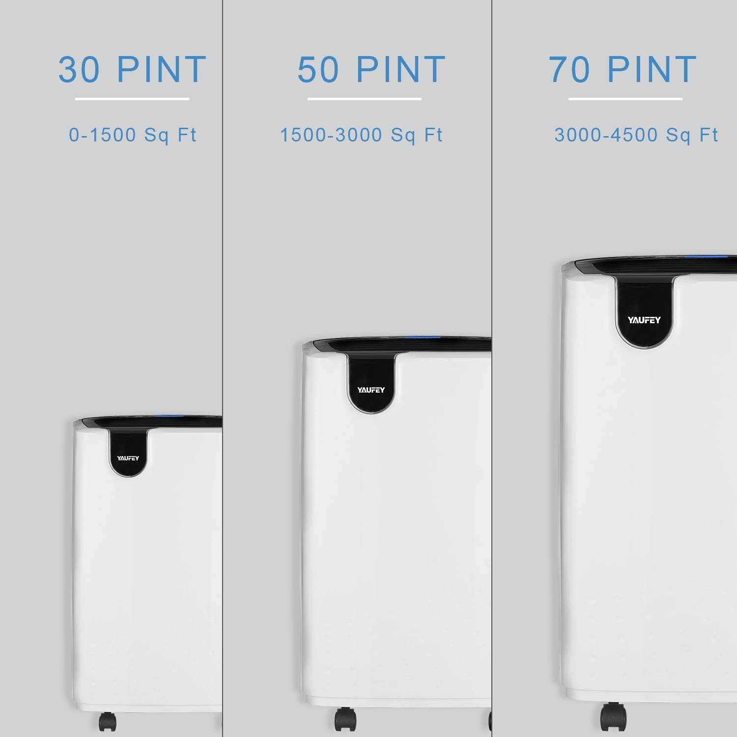 PROFESSIONAL AND EFFICIENT DEHUMIDIFICATION. With its powerful compressor, Yaufey 30-pint dehumidifier removes up to 4 gallons of moisture per day. Compared to some cheap mini dehumidifiers of other brands(removing up to only 9 ounces of water /day), it more quickly and effectively, suitable for home, bathroom, bedroom, basement, garage, and other indoor spaces up to 1500 Sq Ft.