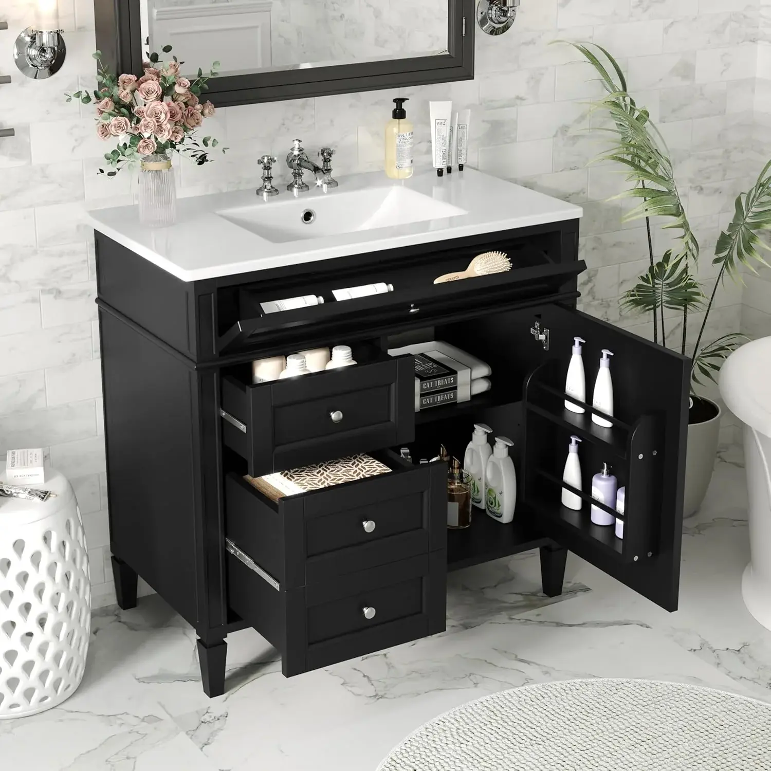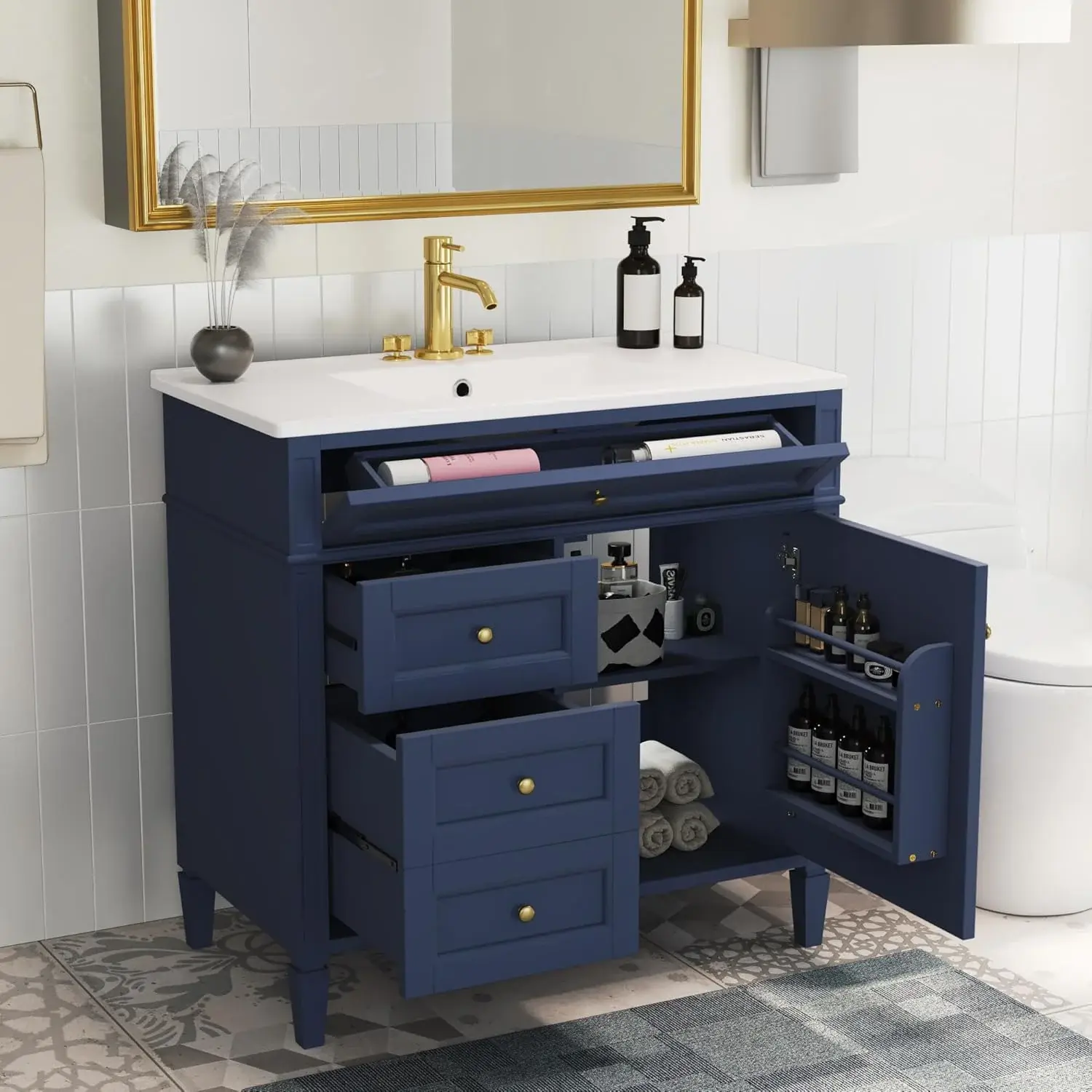 • 36" Bathroom Vanity with Single Sink Combo, Modern Undermount Bathroom Sink Cabinet with 2 Drawers and a Tip-Out Drawer, Freestanding Bathroom Vanities, Soft Closing, Solid Wood Frame