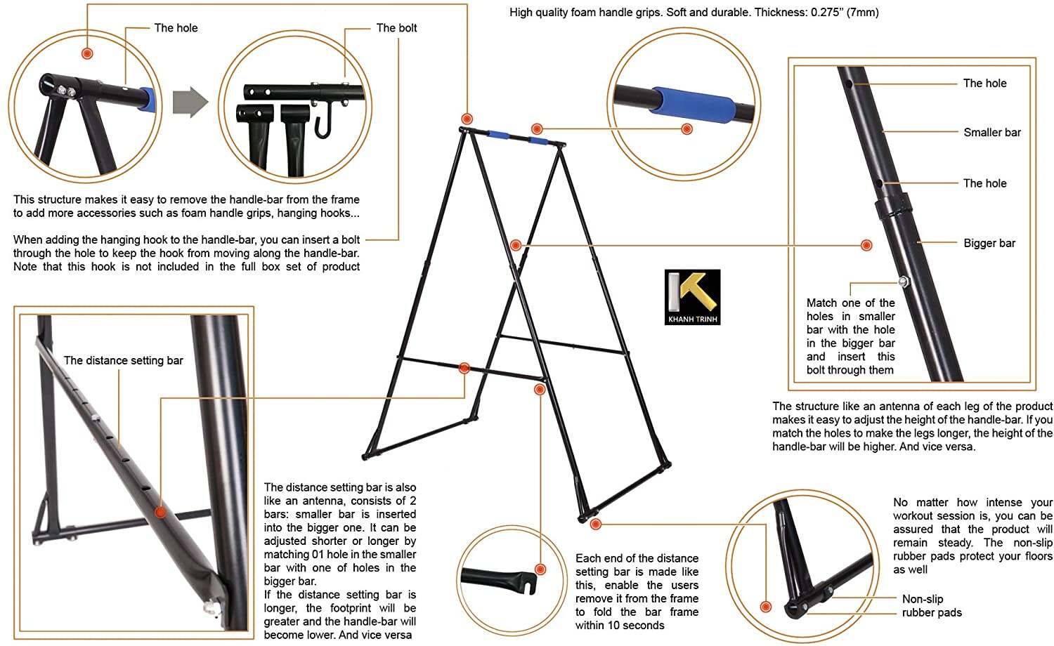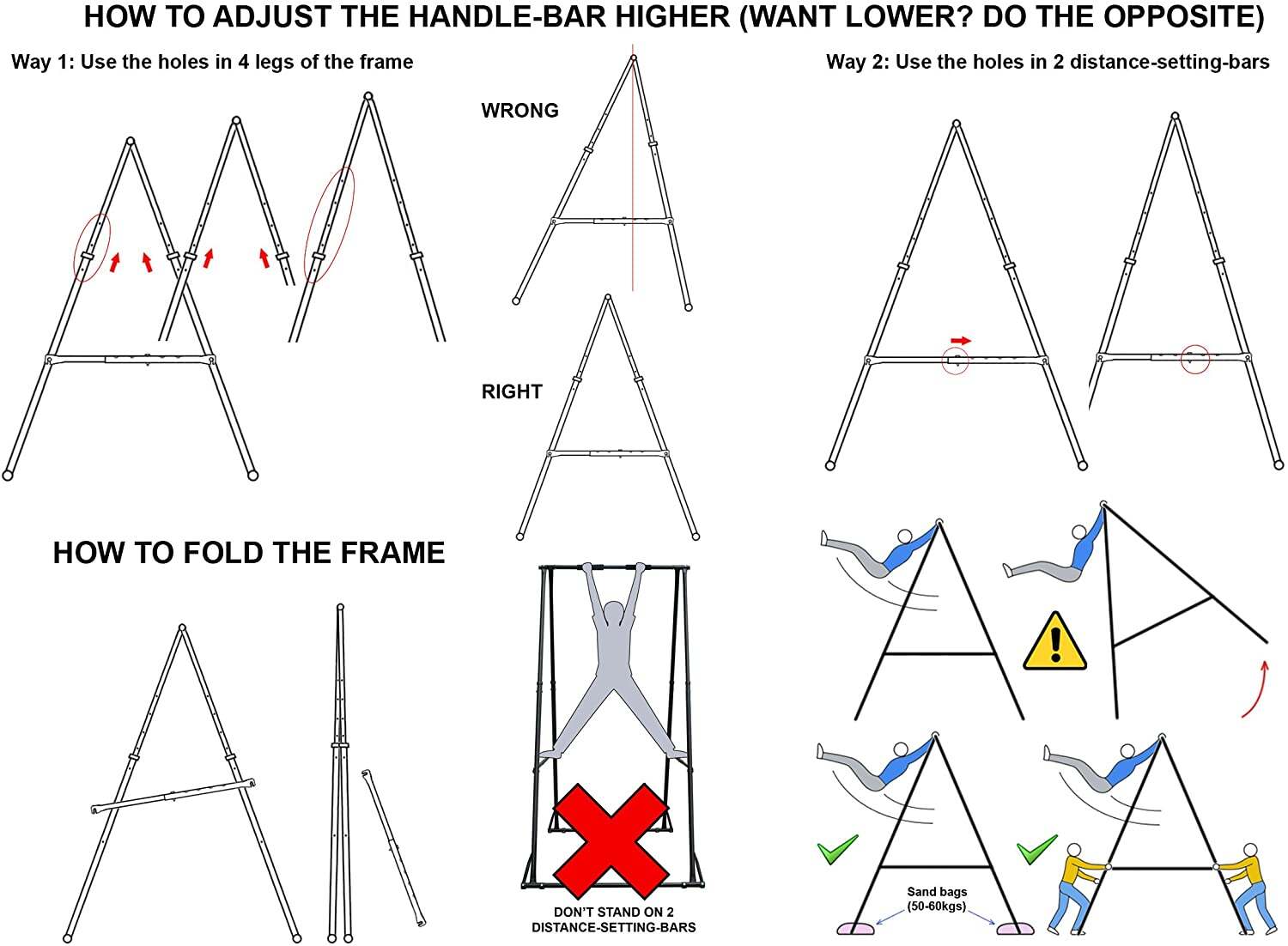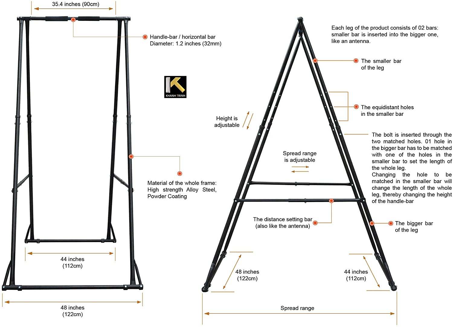 - HIGH QUALITY KT YOGA SWING STAND FRAME: Made from high-strength alloy steel and Powder Coating outside. It��s easy to set up and adjust the handle-bar height (without spanner wrench) from 70.86���� �� 100.78���� (180cm �� 256cm). It��s high enough to hang aerial yoga hammock but not exceed your ceiling so you can put it in any room. This KT indoor outdoor foldable stand frame can bear up to 661.38 lbs(300kgs). Its weight: 61.73 lbs (28kgs)