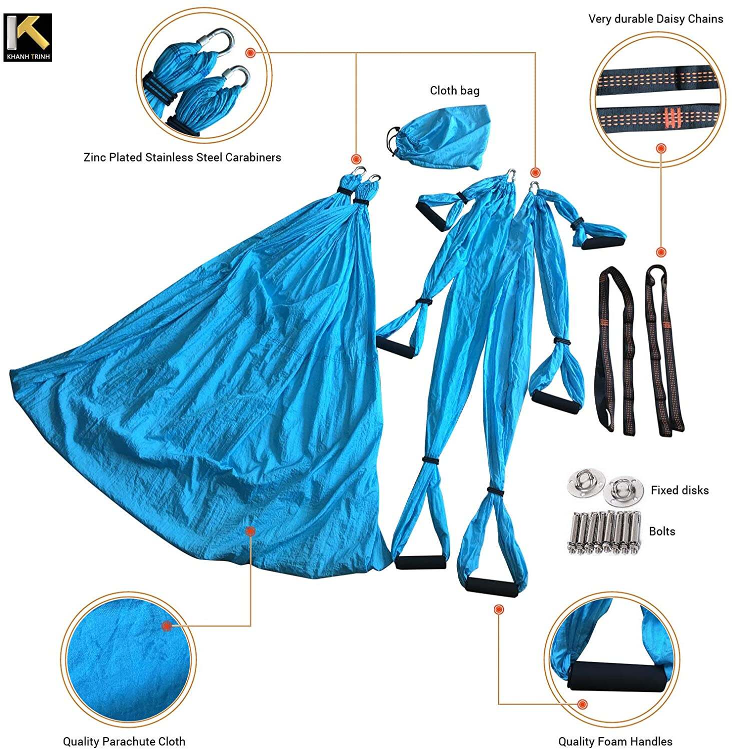- HIGH QUALITY YOGA HAMMOCK AND KITS: The KT fly yoga hammock is made of 210T/70D parachute cloth, bearing up to 661.38 lbs (300kgs). You can check the pictures to understand quality of our hammock. Two men sitting on it without any problem. Durable cloth with good seams ensure you can use this yoga hammock safely for a very long time. Full kits includes: 02 daisy chains (each 39.37���� long), 04 zinc plated stainless steel Carabiners, cloth bag, 02 fixed disc and bolts.