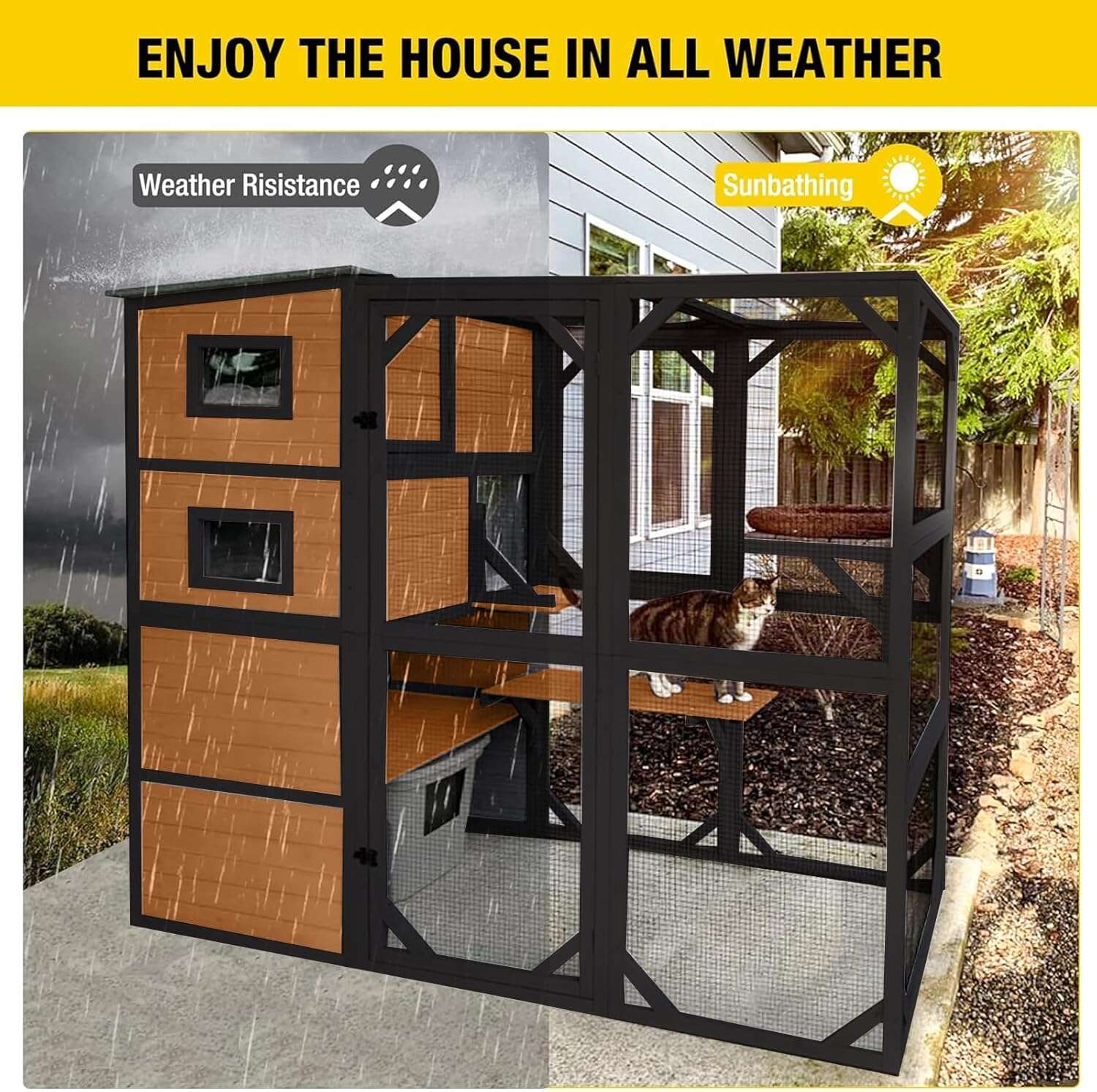 • Weatherproof roof �� keeps cats dry and shaded in any weather
