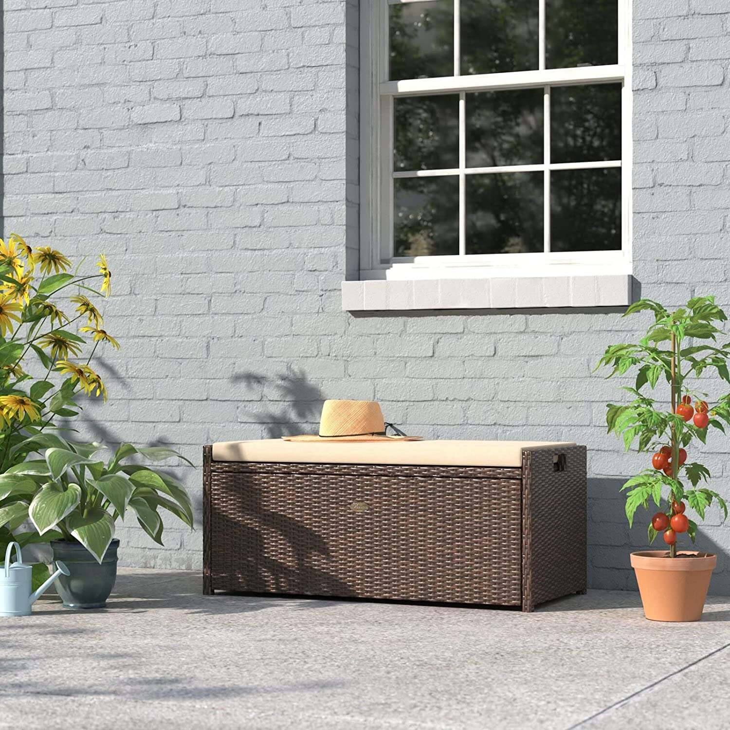 • Barton Outdoor Storage Bench Rattan Style Deck Box Wicker Patio Furniture Water Resistance w/Seat Cushion, 60-Gallon, Brown
