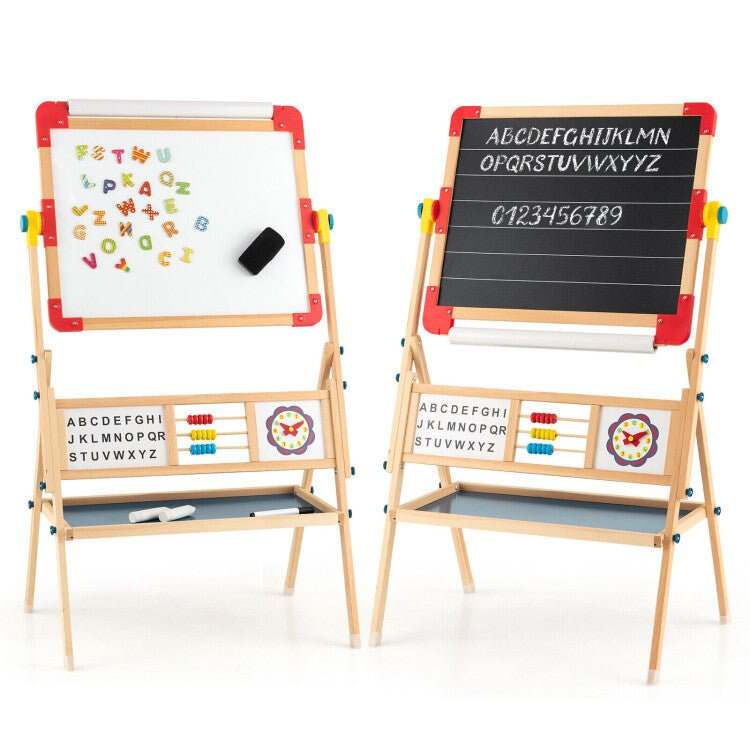 - BEST GIFT FOR EARLY EDUCATION - The toddler wooden easel stand includes multiple educational areas, such as the abacus, clock, and alphabet, which is conducive to early education. These learning areas will cultivate children's cognition of math, English, and art. Likewise, the cute clock helps kids develop the notion of time.