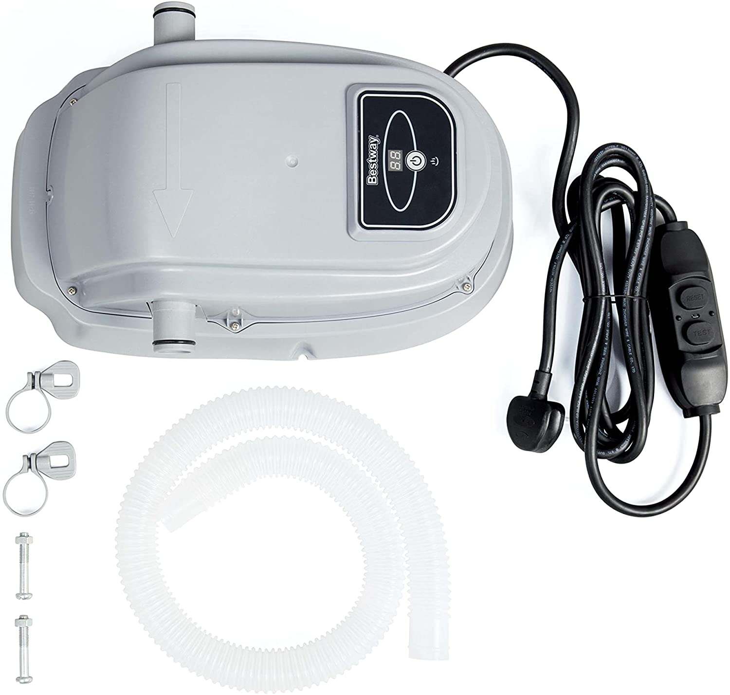 Bestway Pool Heater is a simple and effective to warm up water in your above ground swimming pool, transforming it into a comfortable and relaxing space to swim, paddle and play in. The pool heater is powered through an electrical outlet. It comes with two hoses and attachments, one of which connects the heater to a filter pump and the other to a pool. Water is pumped into the heater via the filter pump, warmed up as it passes through and then pumped back into the pool. The heater is compatible with pools measuring 15ft or smaller (water volume of 400-500gal) and filter pumps or sand filters with a flow rate of 1,000 gal/hr. (3,785L). Depending on pool size and water temperature the heater can take anywhere from 12 hours to 3 days to reach your desired temperature. If clambering into a freezing pool is making you look and feel blue then the Bestway Pool Heater is the accessory for you!