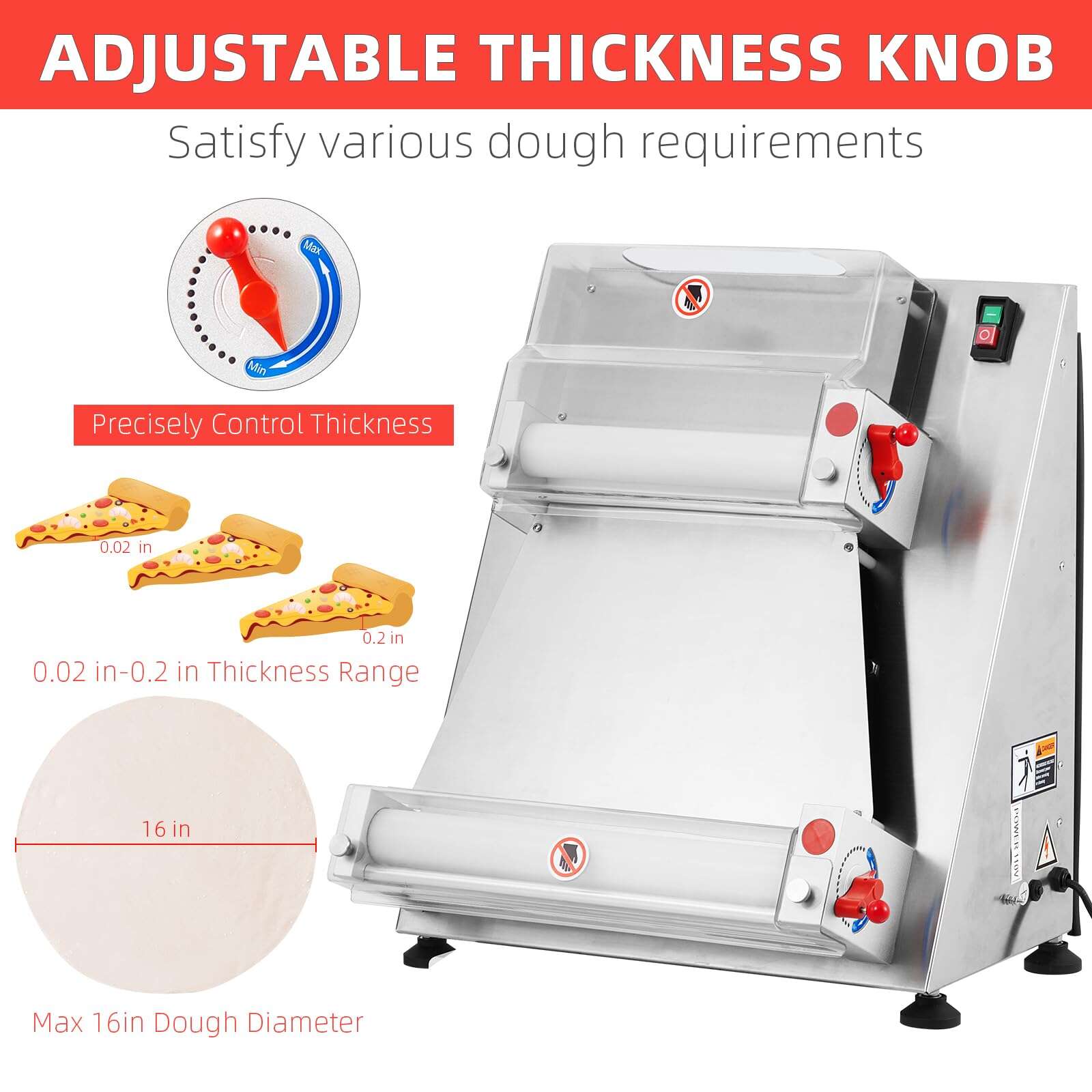 • Adjustable Thickness & Size: Create dough from 0.02′ to 0.2′ thick and 4′ to 15.7′ in diameter.