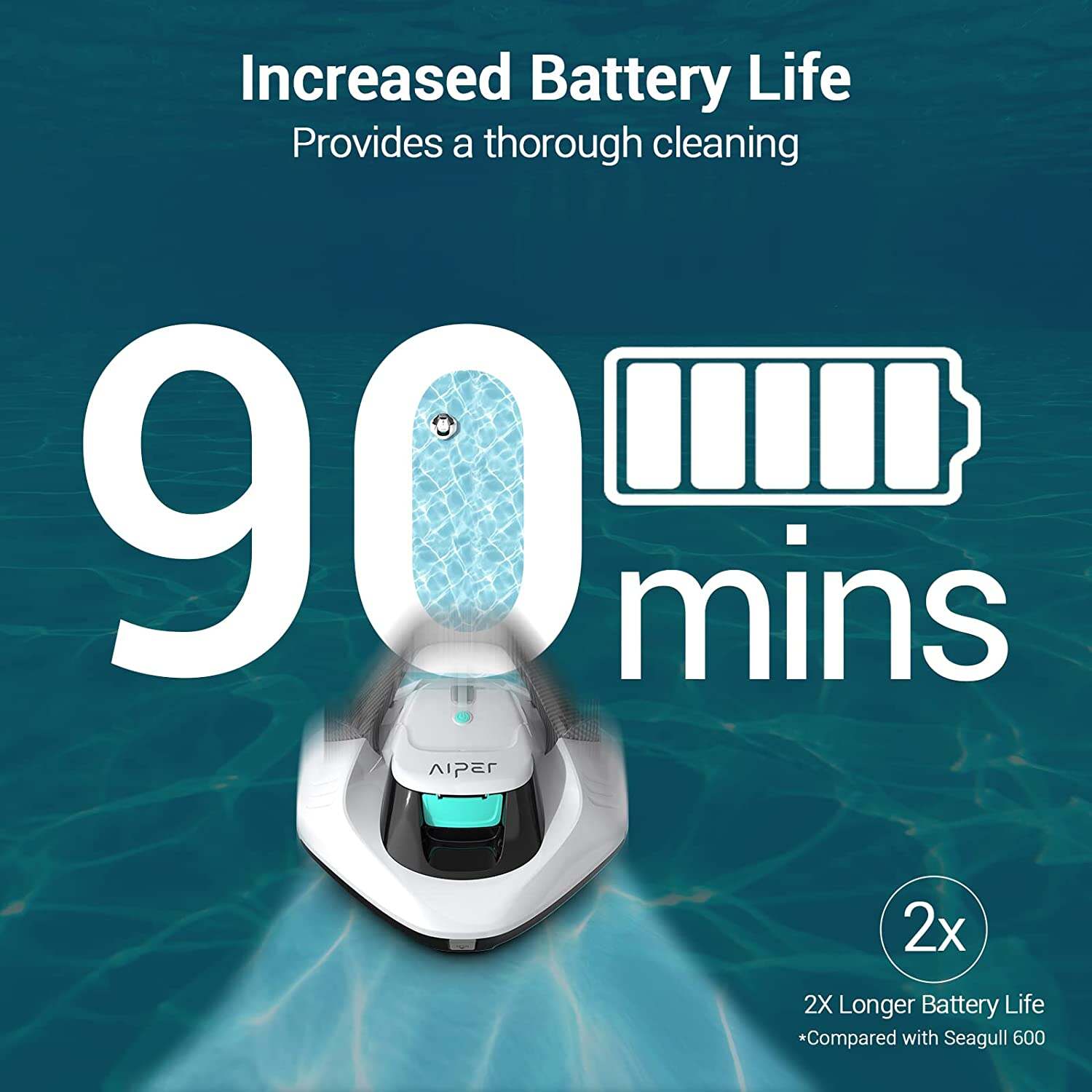 - WIRELESS AND SAFER CLEANING: Say goodbye to wires thanks to the Aiper Pool Vacuum's 100% cord-free design. No worry longer about cord entanglement and the risk of power short-out. It lasts up to 90 mins ideal for round ABOVE-GOUND pools (up to 33' diameter), and IN-GROUND flat bottom pools (ONLY ONE DEPTH, up to 40' X 20').