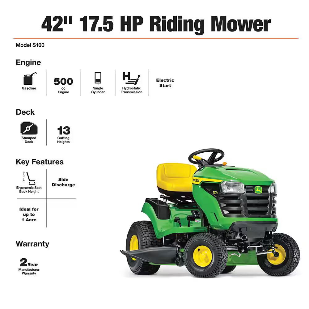 John Deere S100 42-in 17.5 HP Riding Lawn Mower – Reliable Hydrostatic Drive