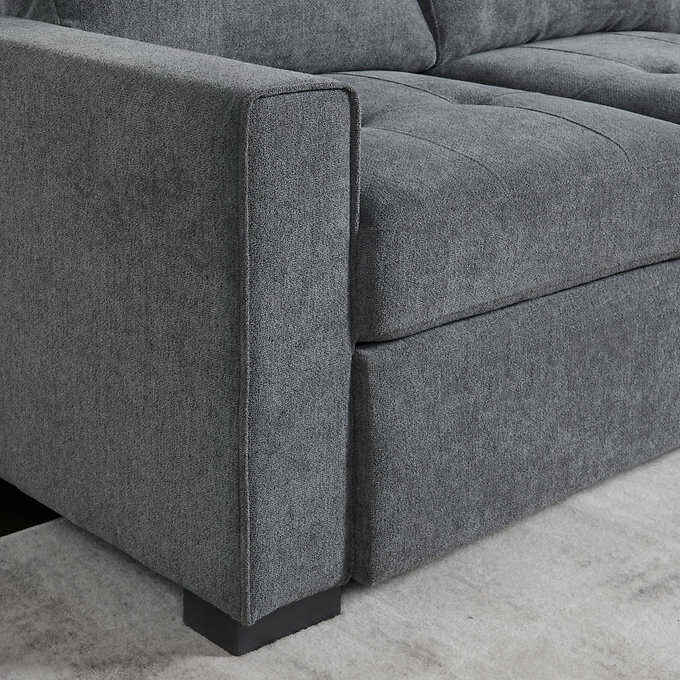 The Kendale Fabric Sofa Chaise was designed with today’s consumer in mind, offering comfort and function in addition to style. The high-density foam cushions offer a comfortable seat, while drop-in pocket coils and sinuous springs prevent sagging. Easily accommodate guests with a pull-out bed and storage compartment for blankets and pillows. The storage and bed pulls can be easily tucked under the cushions when not in use. Kendale is upholstered in ATHENA performance fabric, that is stain-resistant, water repellent and easy to clean. While durable, the gray fabric is also soft to touch. Sleek track arms and solid wood block feet give Kendale a contemporary feel, while flange welt trim, button less tufting, and box edge cushions offer a tailored look.