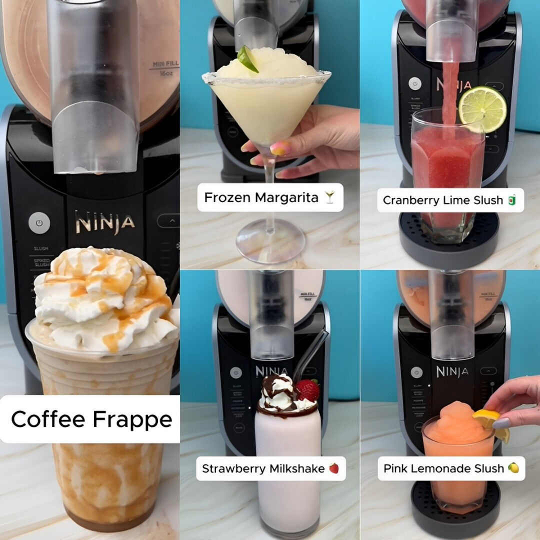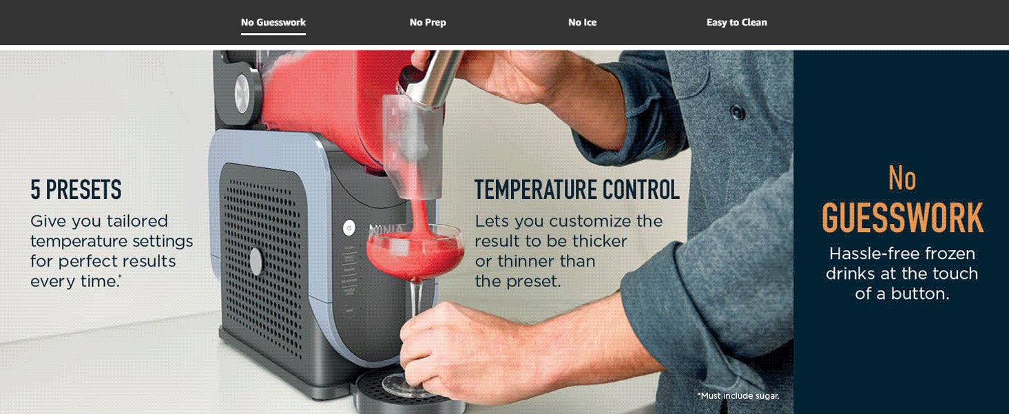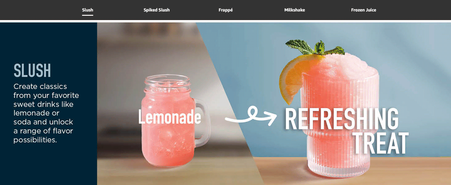 5 preset settings: Slush, Spiked Slush, Frappé, Milkshake, Frozen Juice. Temperature control lets you customize whether you want the output to be thicker or thinner than the preset.