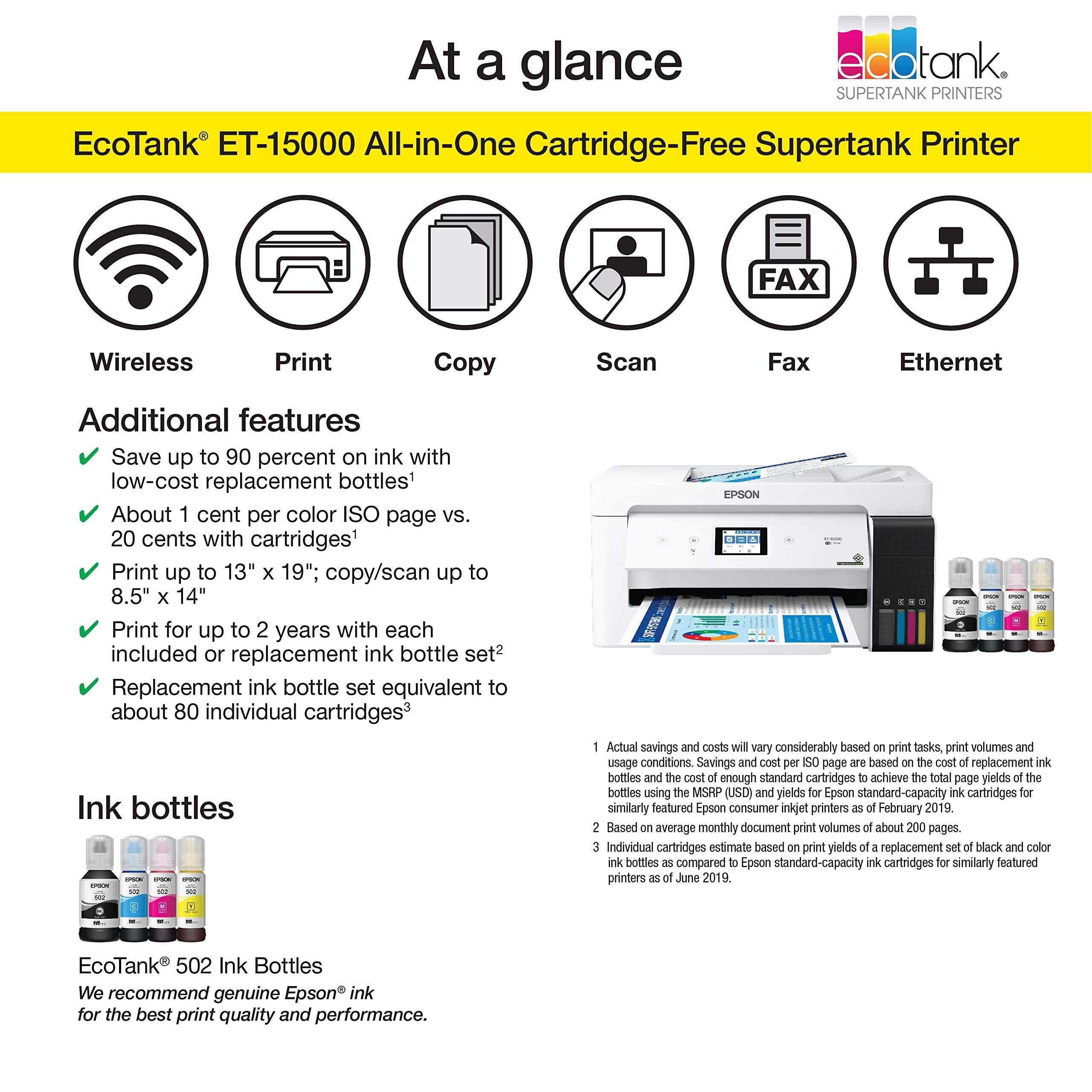 EcoTank ET-15000 Wireless Color All-in-One Supertank Printer with Scanner, Copier, Fax, Ethernet and Printing up to 13 x 19 Inches