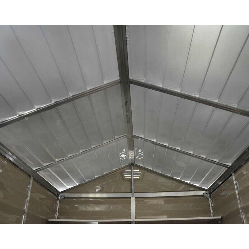 The SkyLight Shed is perfect for storing organizing and protecting your outdoor life. Made with Palram - Canopia's virtually unbreakable polycarbonate and reinforced aluminum frame, the SkyLight Shed will provide years of maintenance-free protection. At first you may wonder about the flexibility and thickness of the polycarbonate panels, but rest assured that once assembled, the shed will be rigid and durable. The unique SkyLight polycarbonate roof panels transmit natural sunlight throughout the day while having an opaque external visibility for maximum privacy. Front and back vents are included for ample airflow. Palram - Canopia SkyLight sheds do not fracture, bend or discolor, withstanding harsh weather conditions such as hail and high temperatures. Designed with your outdoor space in mind, the SkyLight Shed will complement your home and enhance your outdoor living space.