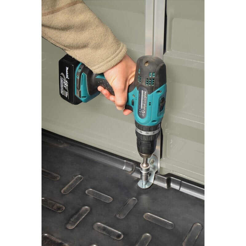 - Anchor the shed onto a solid surface, use suitable screws and plug, (screws and plugs are not supplied)