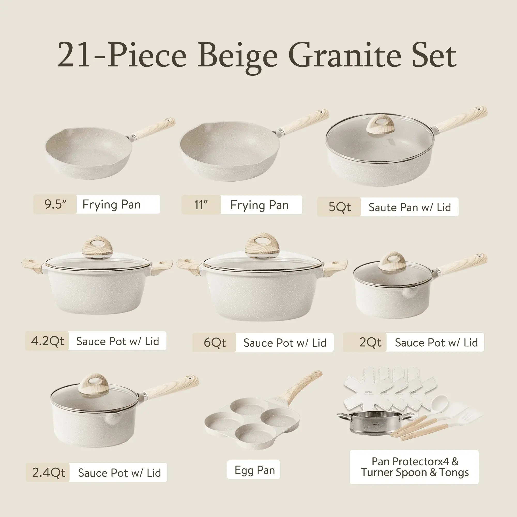 Carote Non Stick Pots and Pans Set, 21 Pcs Induction Kitchen Cookware Sets (Beige Granite)